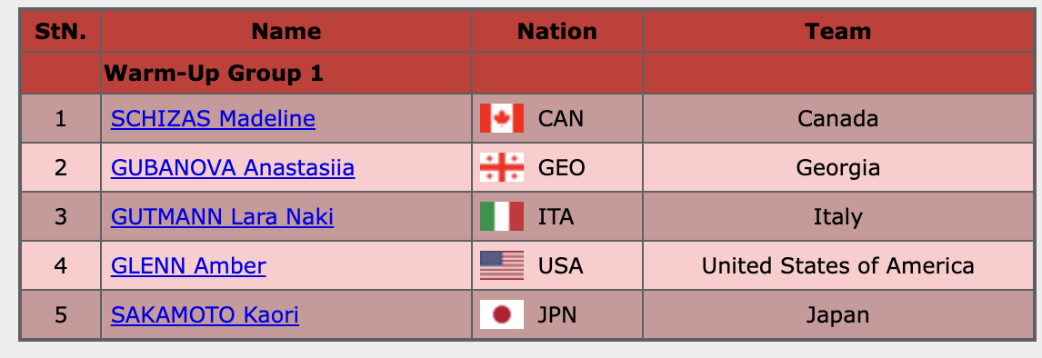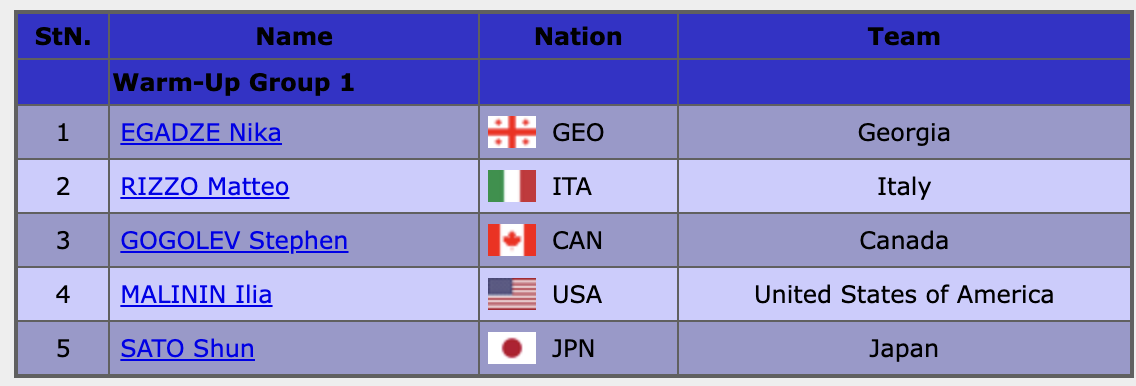 В 23.55 мск на разминку выйдут мужчины. Порядок выступлений (надо кликнуть на картинку):