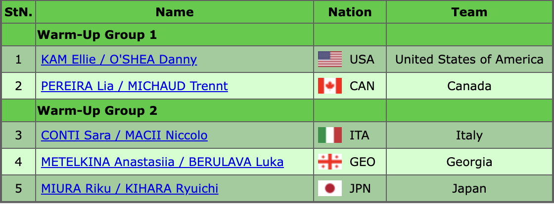 На разминку вышли три пары из второй группы — Сара Конти и Никколо Мачии из Италии, бывшие россияне Анастасия Метелкина и Лука Берулава, которые выступают за сборную Грузии, а также японская пара Рику Миура и Рюити Кихара.