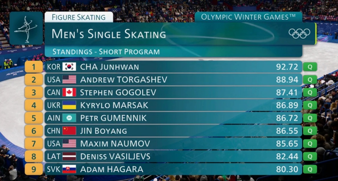 Таким образом, тройка выглядит сейчас так: Грассль (Италия), Ча (Южная Корея), Аймоз (Франция). Гуменник занимает седьмую позицию. Но еще финальная разминка не выступала.