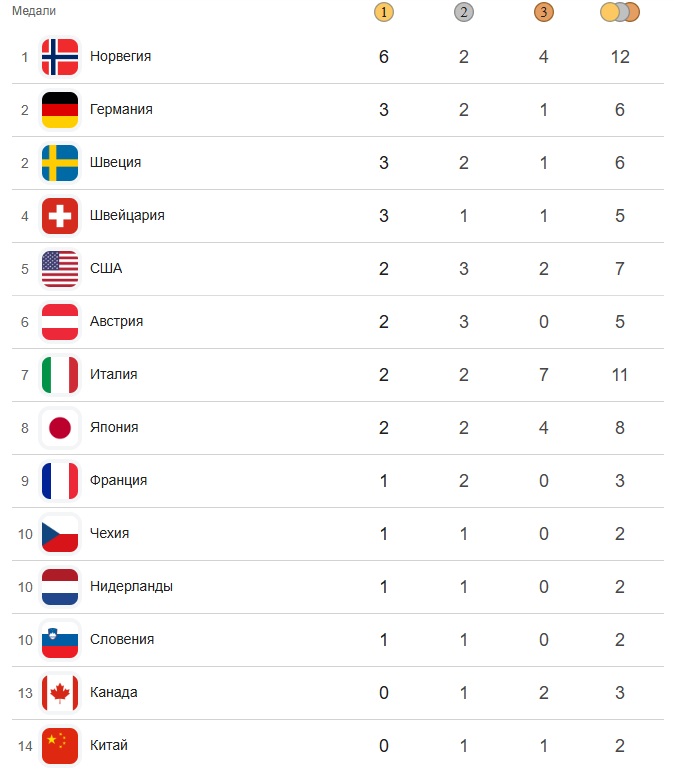 На этом будем прощаться, до завтра. А вот так выглядит медальный зачет Олимпийских игр после четырех дней.