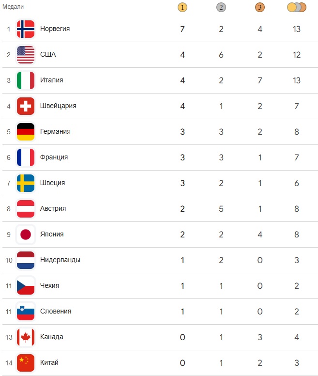 Вот таким получился этот день, уже пятый на Олимпийских играх — 2026. Вот медальный зачет на данный момент. Увидимся завтра.