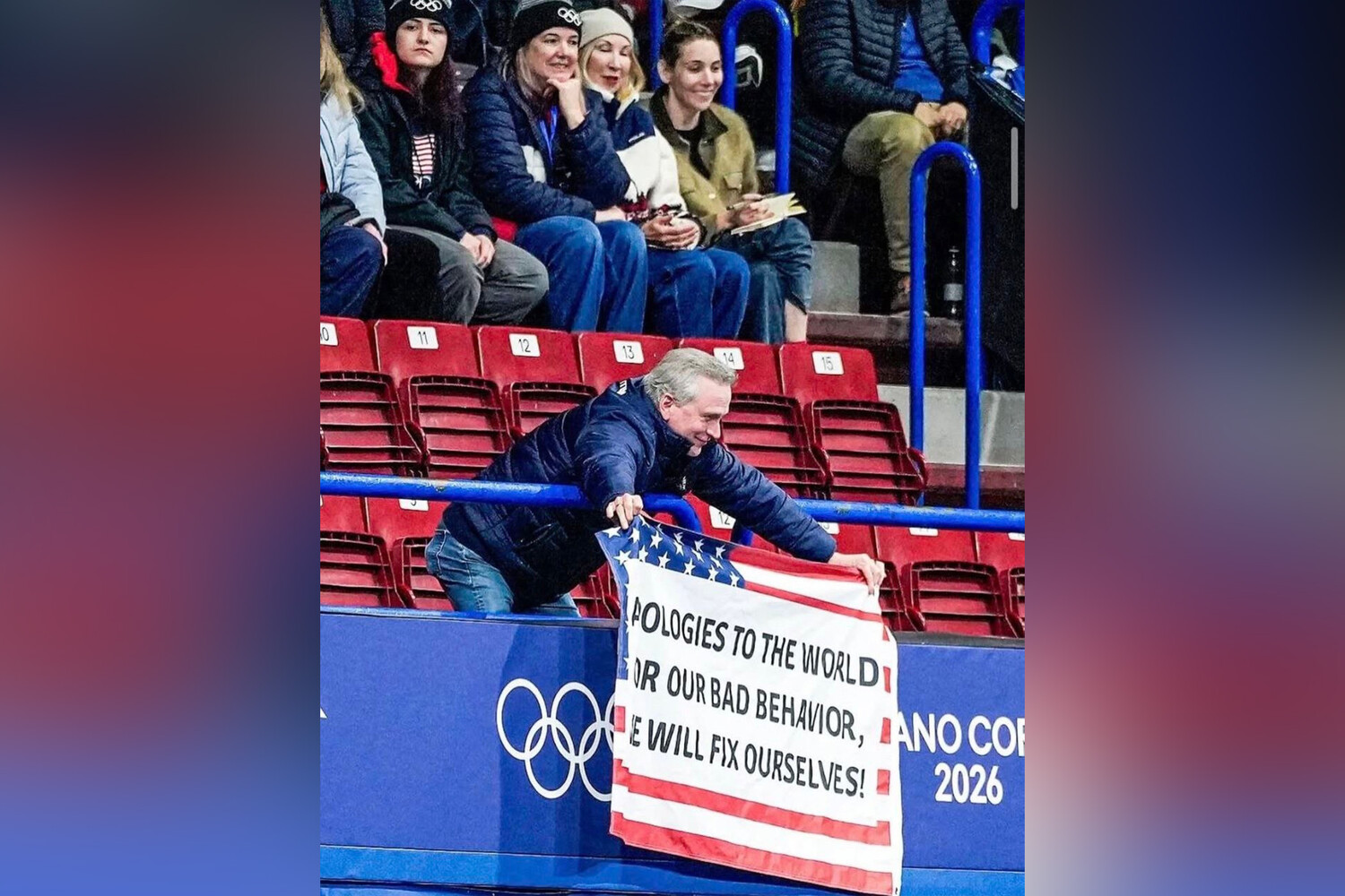 Звездой соцсетей стал американский болельщик, вывесивший на трибунах флаг своей страны с надписью:
