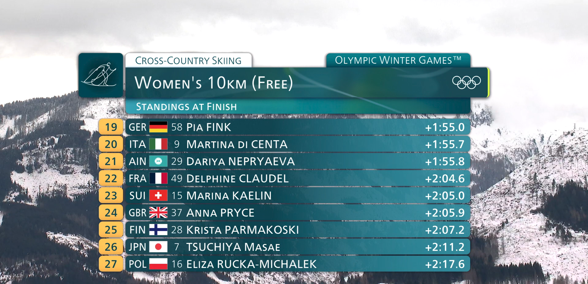 Финиширует Дарья Непряева, отставание от идущей на первом месте норвежки Хейди Венг почти на минуту. На данный момент россиянка располагается на десятой позиции.