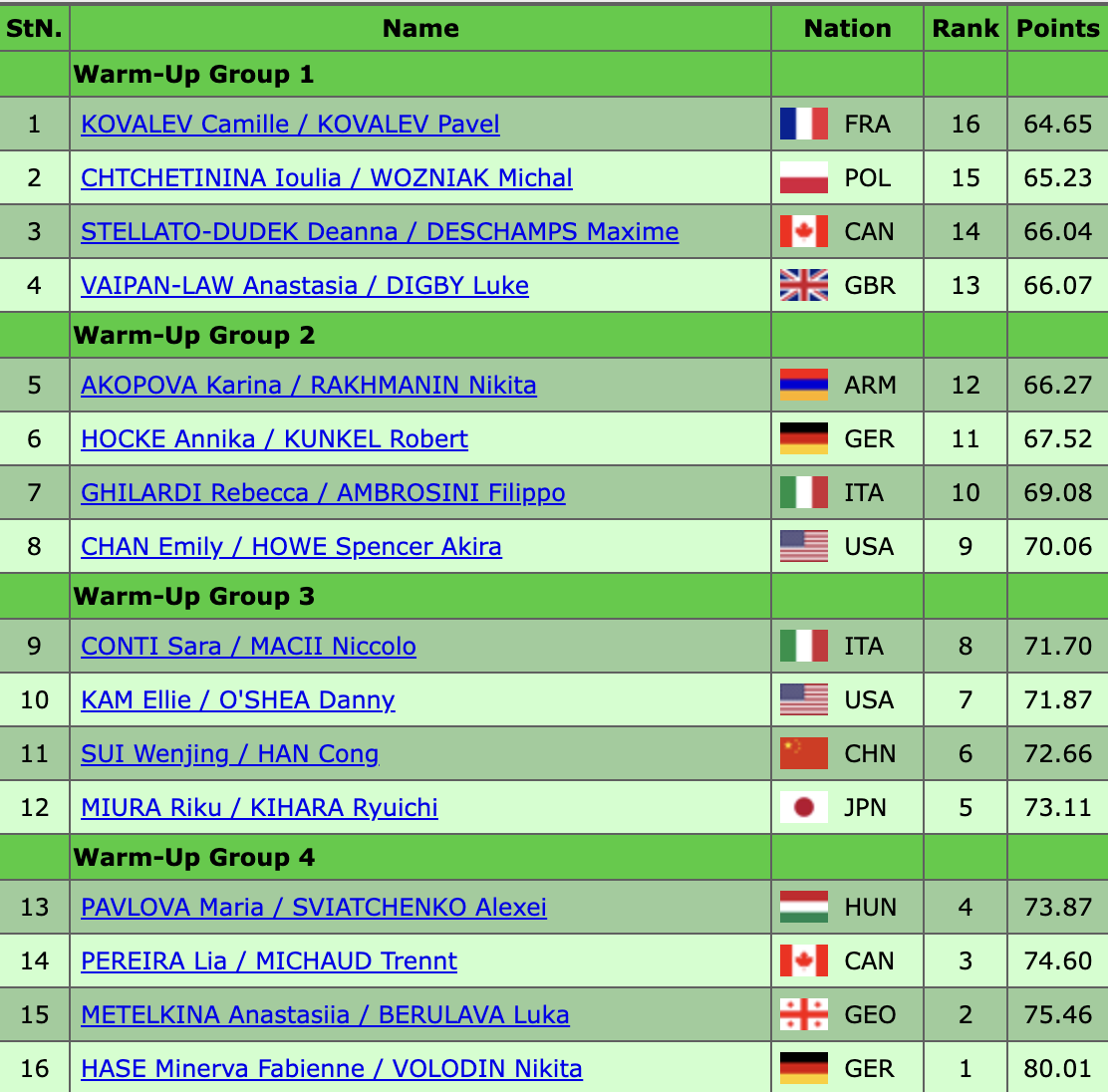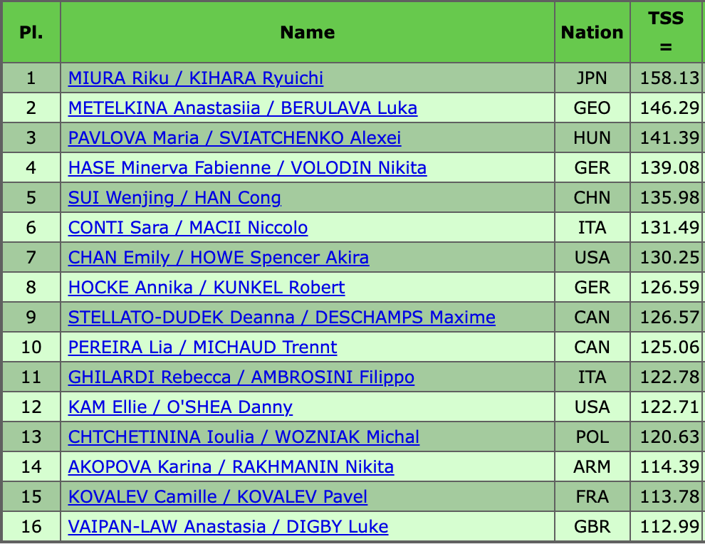 Напомним, что по итогам короткой программы на первом месте оказался бывший российский фигурист Никита Володин, выступающий в паре с Минервой Фабьенне Хазе. На промежуточном втором месте — тоже экс-россияне Анастасия Метелкина и Лука Берулава. Еще одна пара из бывших россиян — Мария Павлова и Алексей Святченко — оказались на четвертой позиции, всего в одном балле от канадцев, которые заняли третье место. Это значит, что сегодня сразу пять экс-российских спортсменов будут бороться за медали. Итоги короткой программы были такими: