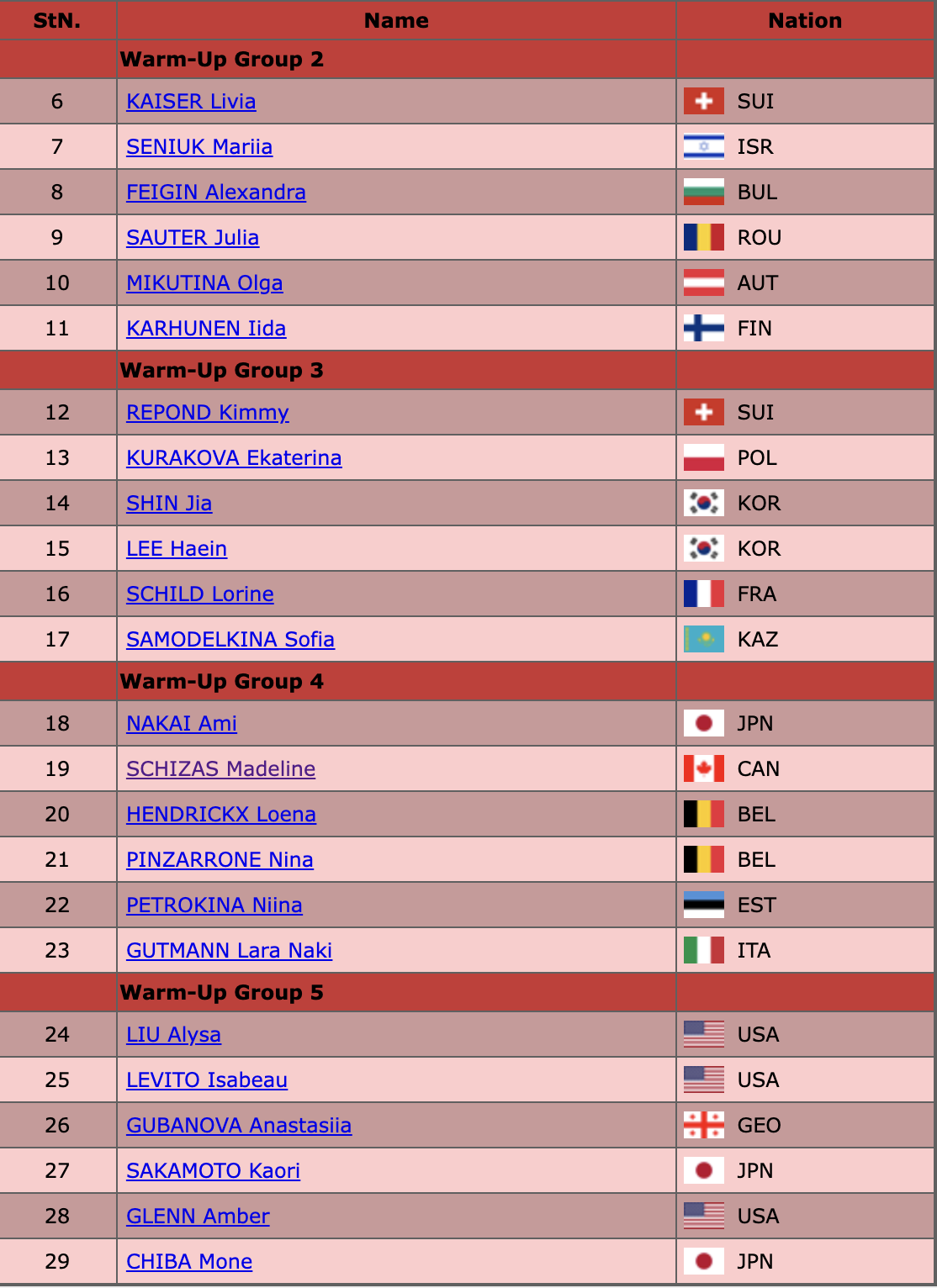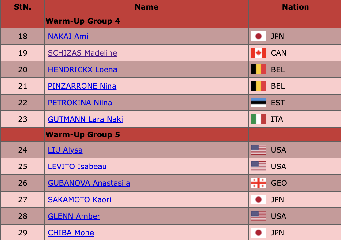 На разминку вышла последняя группа участниц, в которую попали самые высокие по рейтингу фигуристки! Это Алиса Лью, Эмбер Гленн и Изабо Левито из сборной США, бывшая россиянка Анастасия Губанова, которая выступает за Грузию, а также японские фигуристки Каори Сакамото и Моне Чиба.