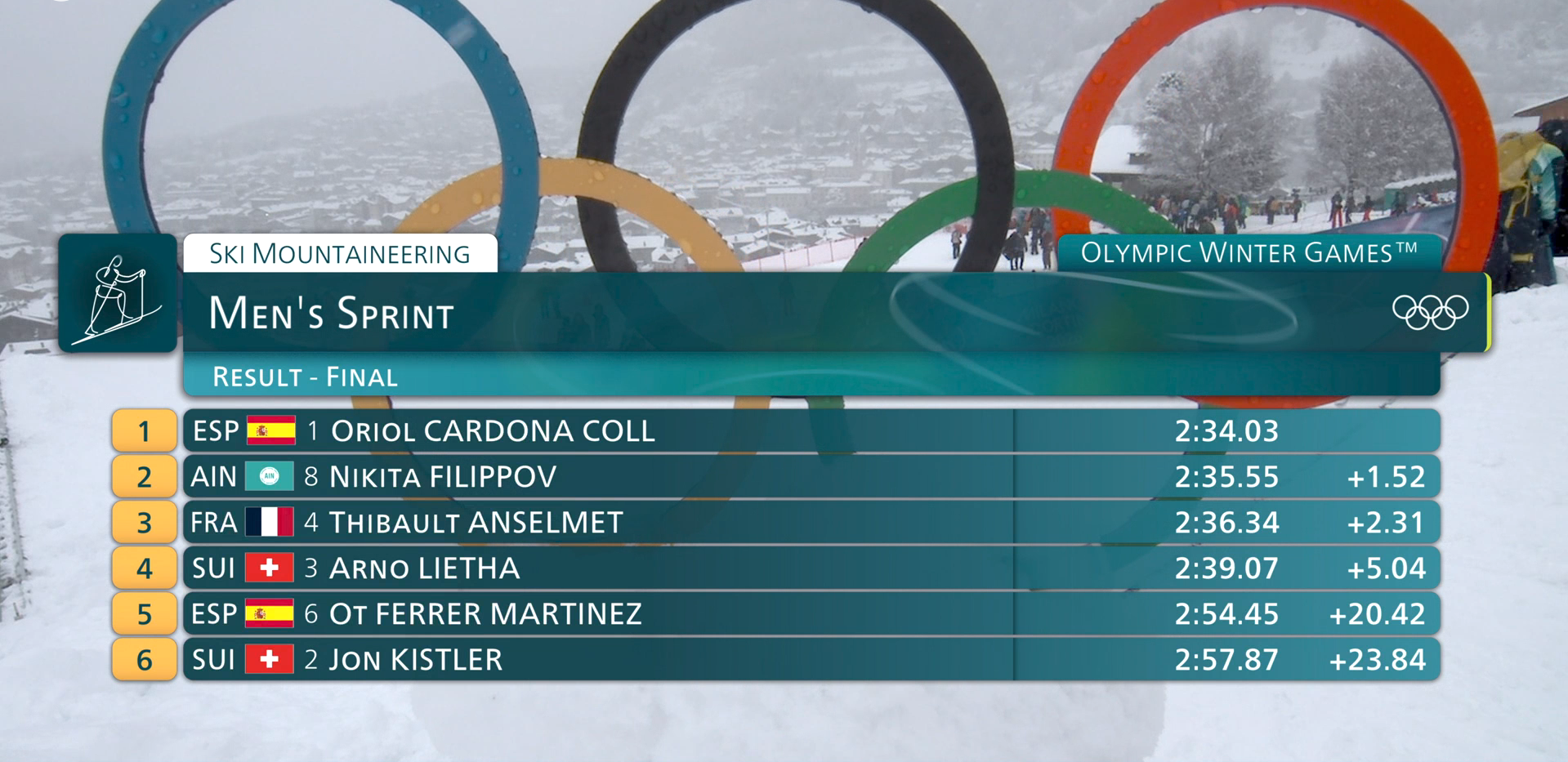 Победителем спринта у ски-альпинистов стал испанец Ориоль Кардона. Испанский спортсмен принес своей стране первое золото зимних Олимпийских игр с 1972 года.