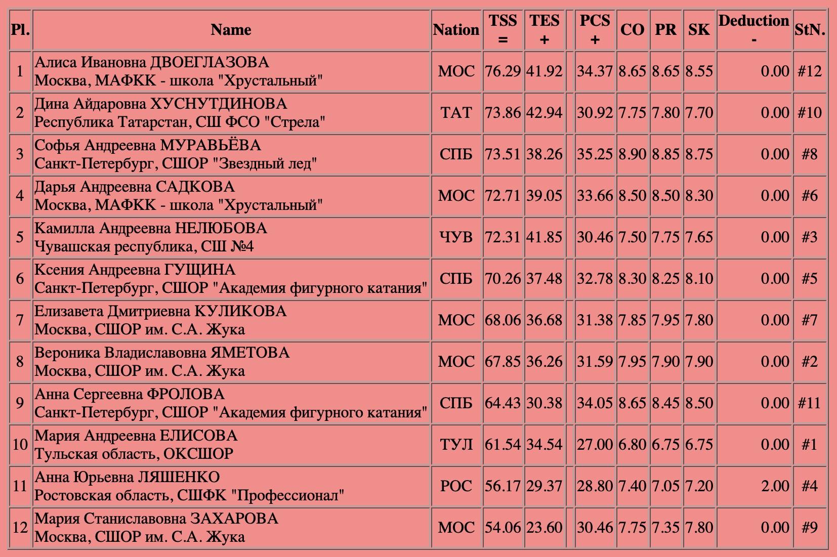 Ярко, но не очень чисто выступила ученица Алексея Мишина под музыку из «Кармен» — программу ставил Илья Авербух. Каскад перенесли во вторую половину, программа была усложнена. Но как раз этот элемент Муравьевой не удался, за каскад она получила Q. Досадная потеря. Тем не менее Софья выходит на промежуточное первое место.