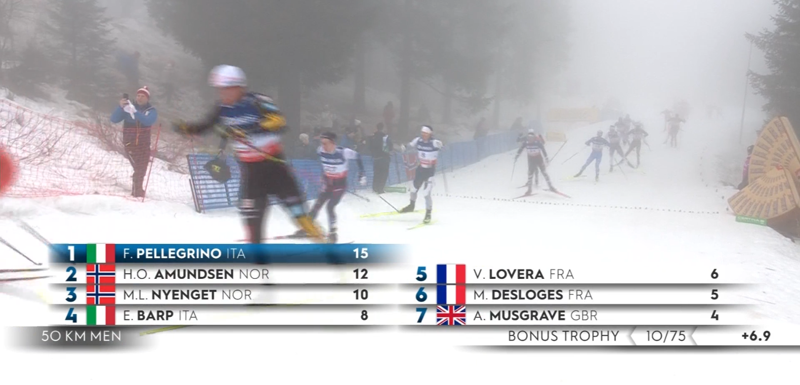 Француз Уго Лапалю сходит с дистанции! То ли выходся спортсмен, то ли лыжи не едут по такой сложной погоде — один из теневых фаворитов гонки завершает ее досрочно!