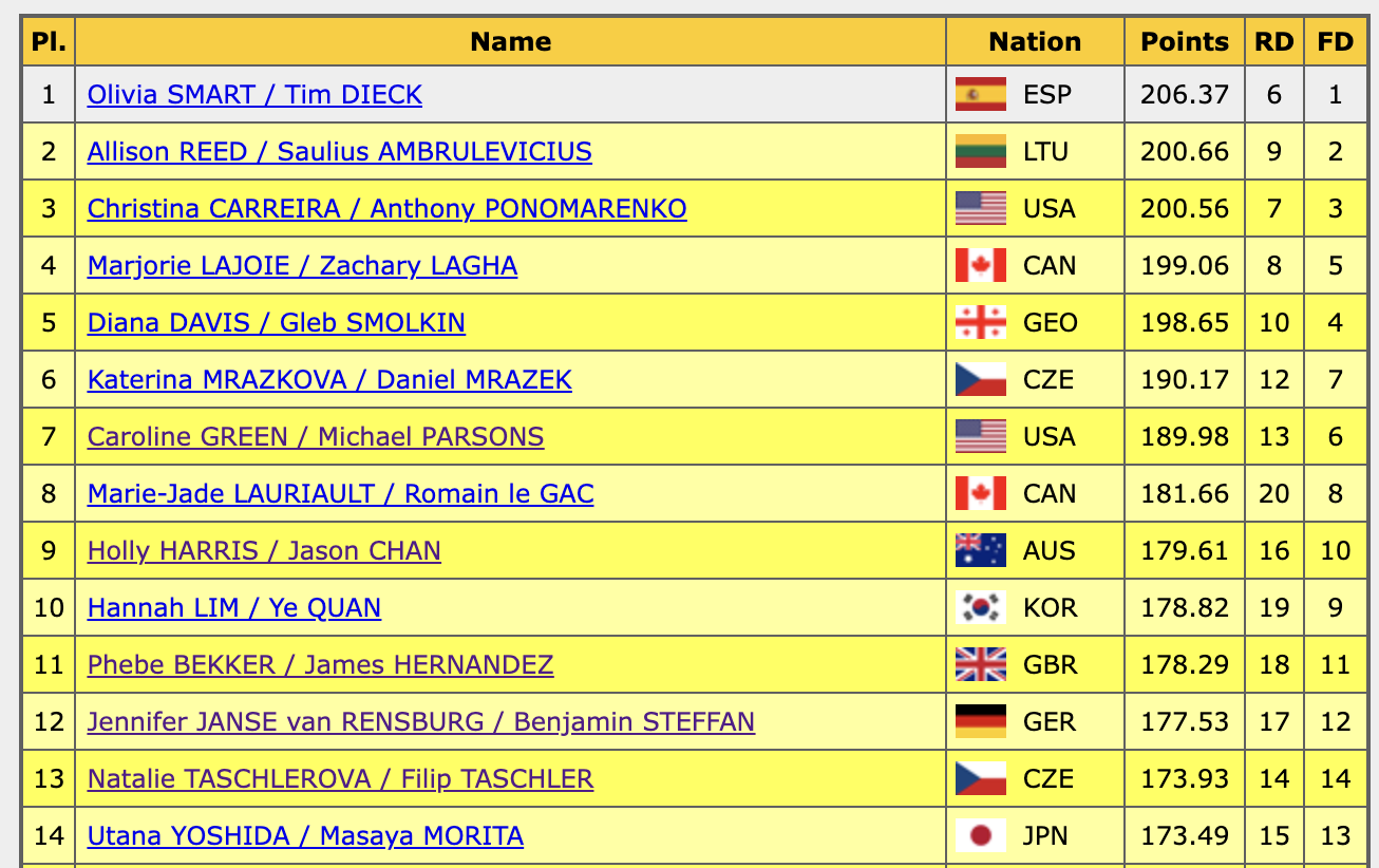 Оценка Дэвис и Смолкина за произвольный танец — 119,31 балла, по сумме — 198,65. Они выходят на промежуточное первое место!