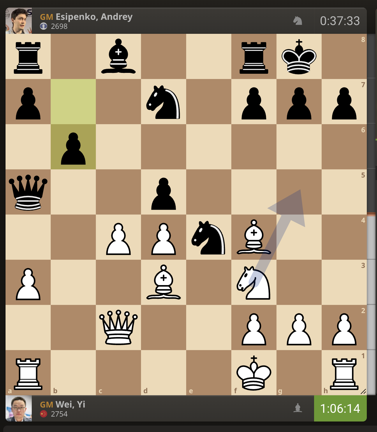 Вэй И перевел коня на d2. У китайского гроссмейстера осталось на 20 минут больше времени, чем у Есипенко, который очень долго думал над последними ходами.