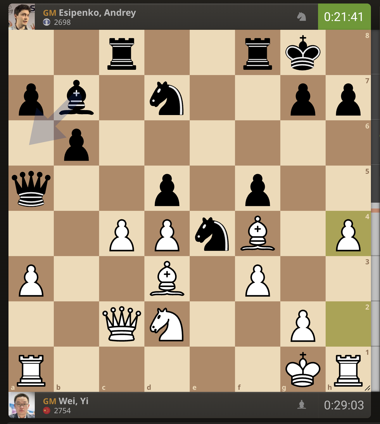 Есипенко не решился взять пешку соперника в ответ и вместо этого пошел своей пешкой на b6.