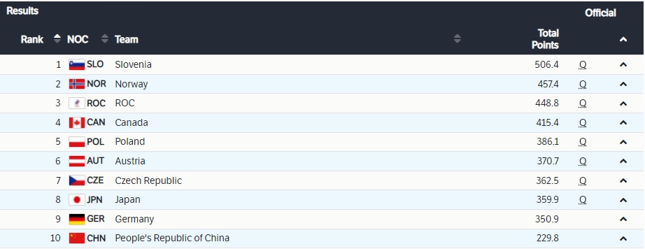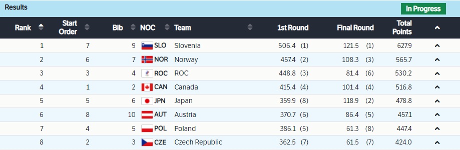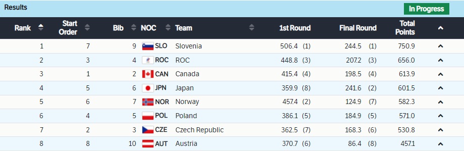 После трех попыток сборная Словении уже фактически олимпийский чемпион, Россия крайне близка к серебру, а Канада — к бронзе. В последней попытке будут прыгать согласно занимаемым местам — от восьмого к первому.