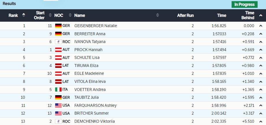 Немка Натали Гайзенбергер, которая тоже была выше Ивановой, обошла и россиянку, и всех остальных во второй попытке. А вот австрийка Лиза Шульте, шедшая третьей, выступила неудачно и теперь проигрывает не только Беррайтер и Ивановой, которых опережала, но и Ханне Прок. Ну а Татьяна Иванова, сломавшая по ходу нынешнего сезона ногу, но восстановившаяся к Играм, будет третьей перед завтрашними двумя решающими попытками!