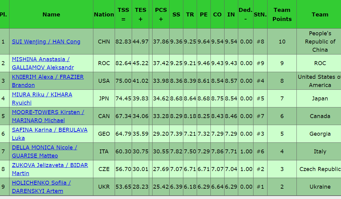 Итак, финальные оценки по итогам короткого проката спортивных пар. Сейчас будем подводить итоги первого дня командного турнира.