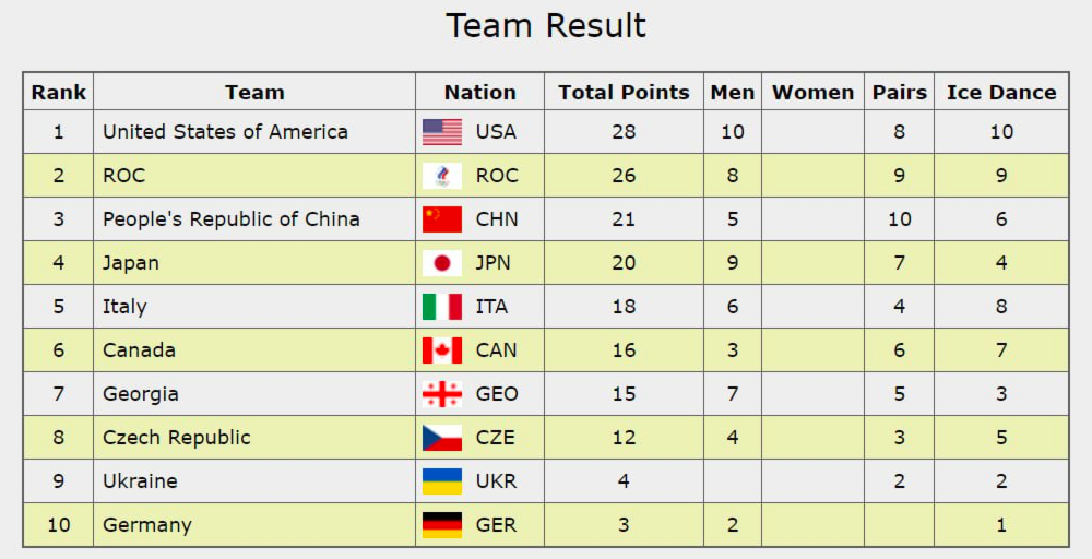 Денис Гладков/«Газета»В зачете командного турнира по фигурному катанию лидирует сборная США, которая набрала 28 баллов. Сегодня американские фигуристы выдали класс, выиграв два вида из трех. Россия занимает второе место и отстает от соперников на два очка. Замыкает тройку лидеров Китай — 21 балл.