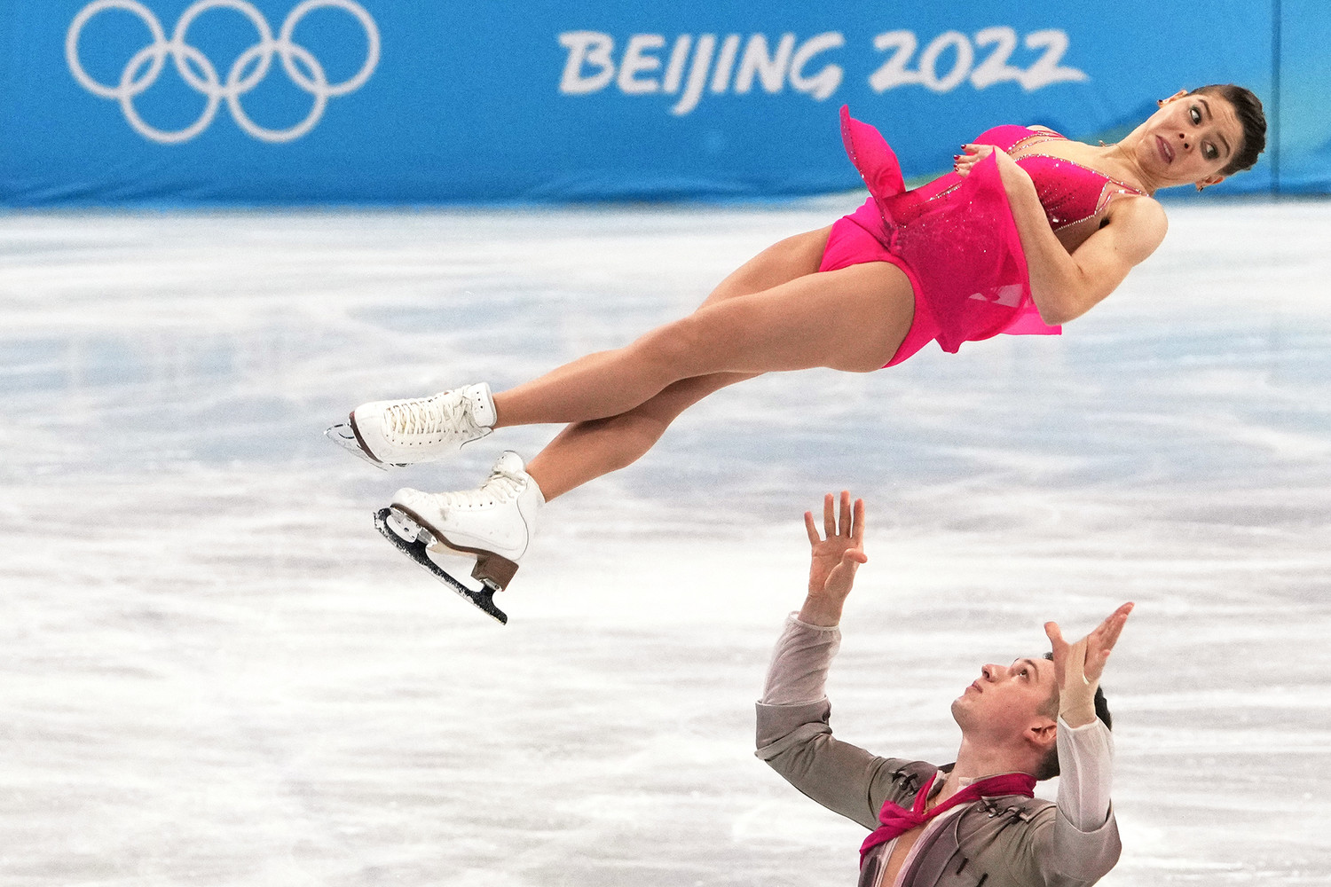 Американская пара Алекса Книерим и Брендон Фрайзер появляются на льду. Напомним, что именно с США мы сражаемся за первое место в командном турнире.