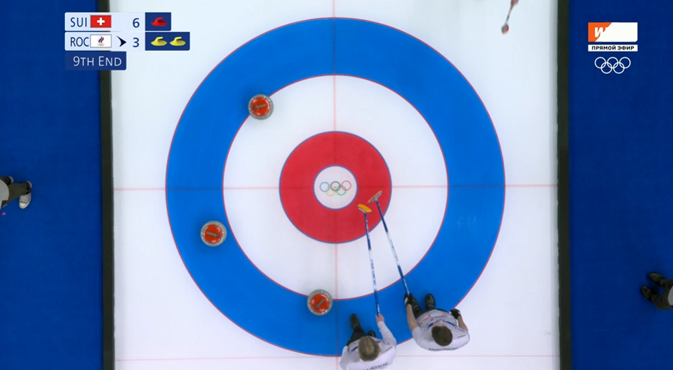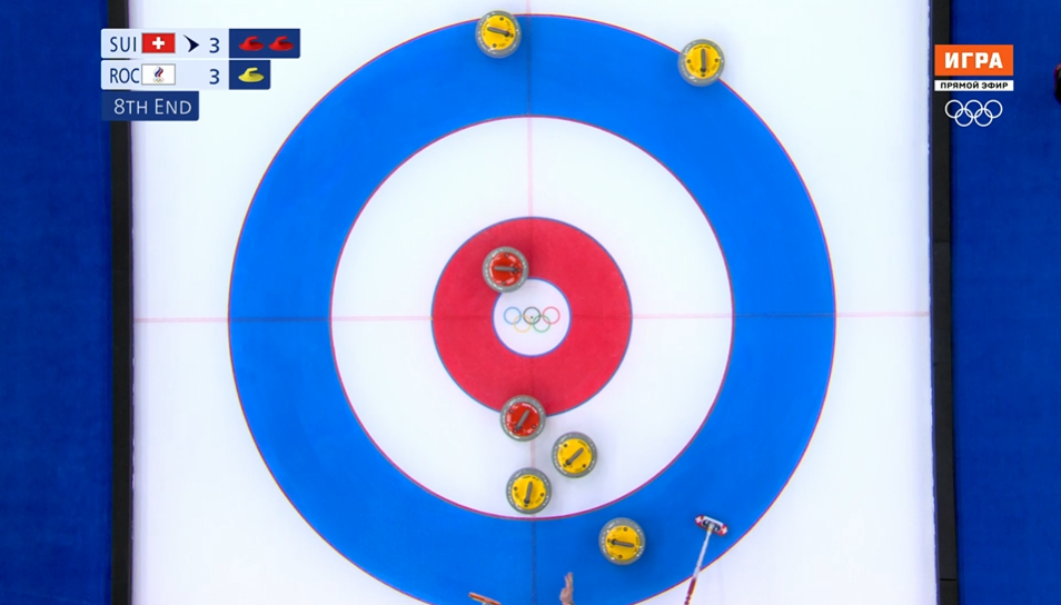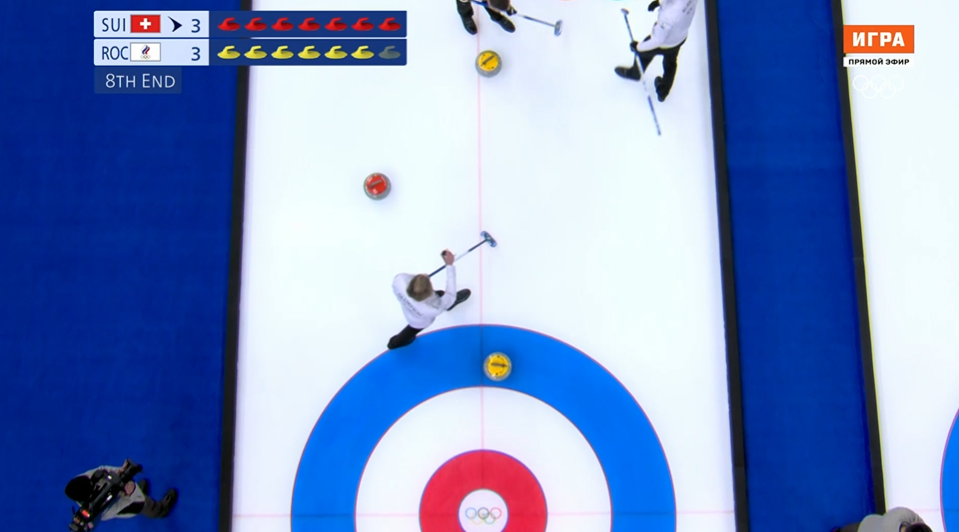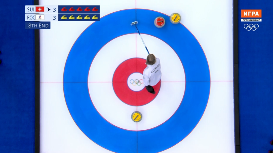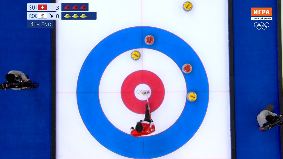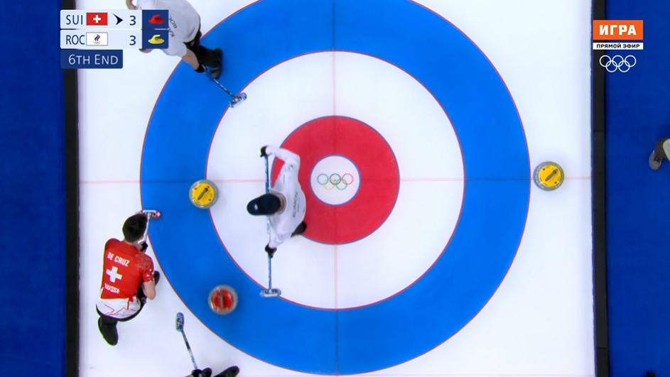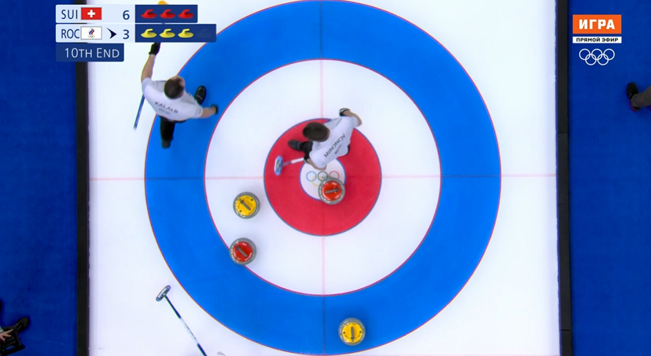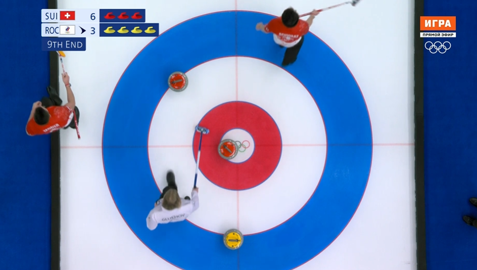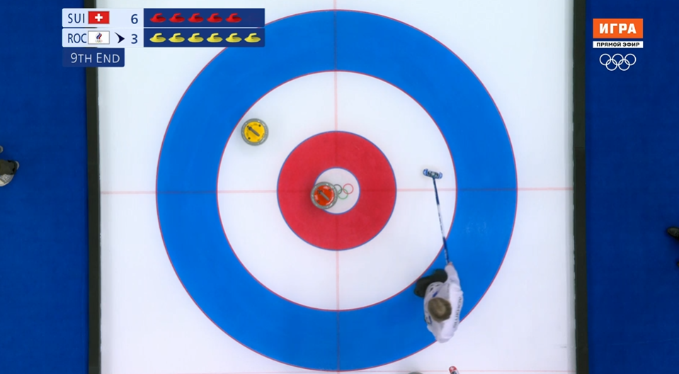 Не самый лучший бросок швейцарцев приводит к нулю в девятом энде. Счет 6:3 в пользу Швейцарии, право на последний бросок остается у России.