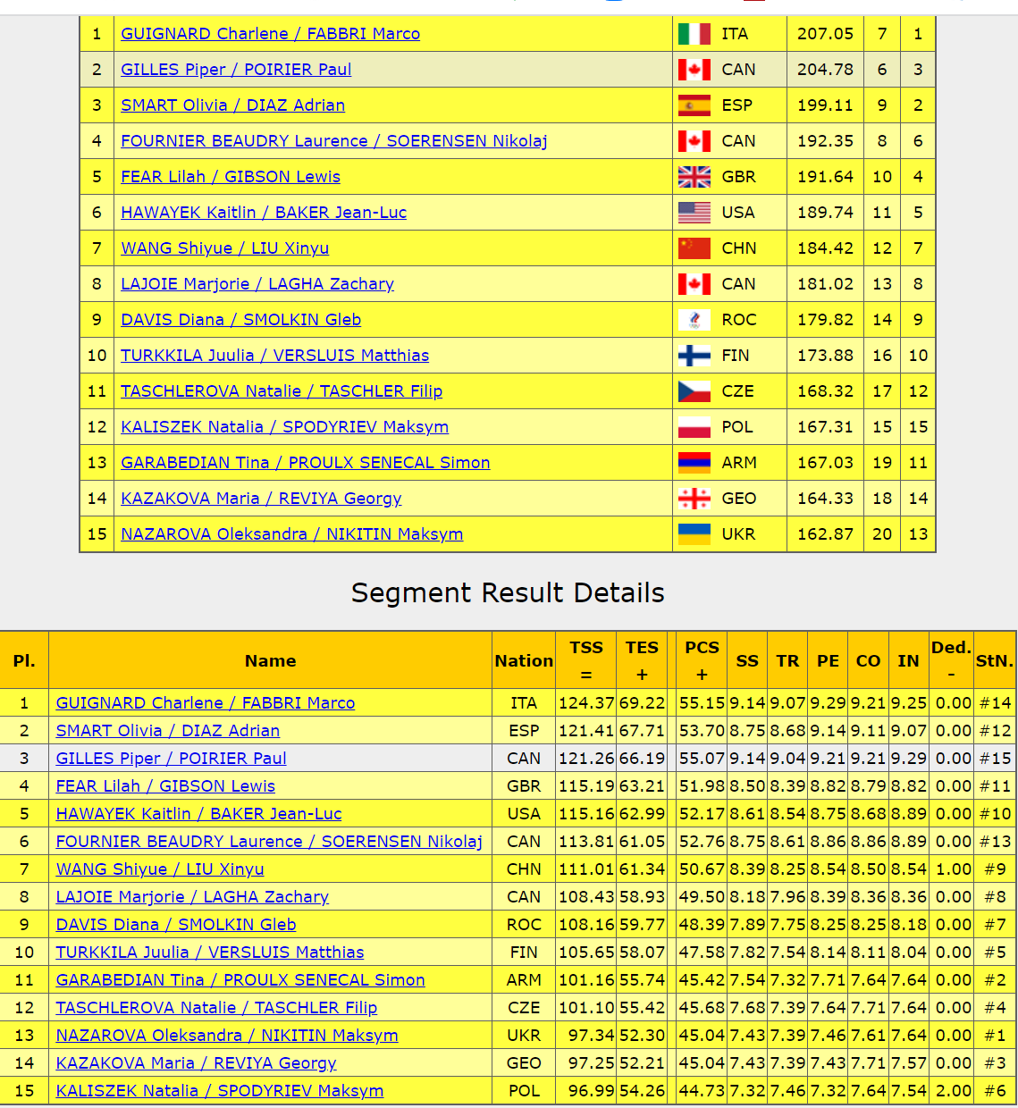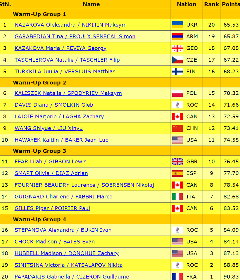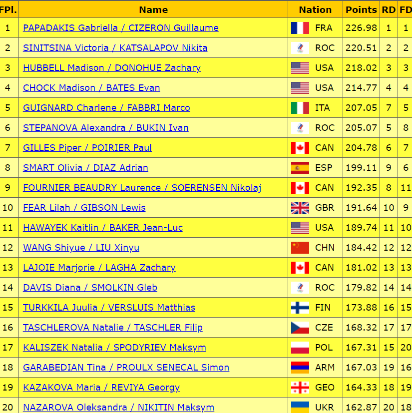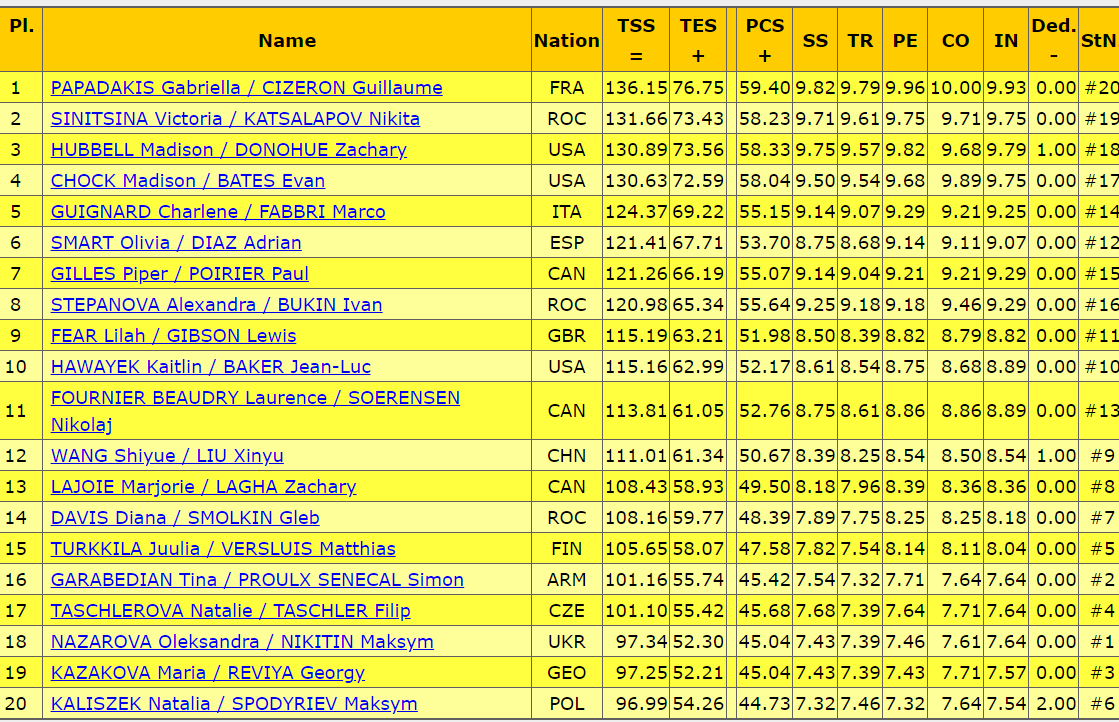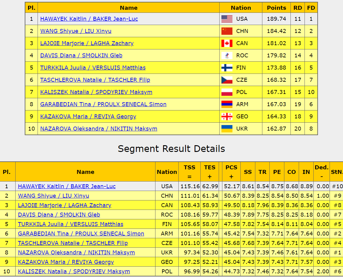 Под саундтрек из мюзикла «Мулен Руж» катается пара. Говоря об этих фигуристах, всегда впервую очередь стоит отмечать их оригинальную хореографию, всегда находит пара какие-то интересные решения, заходы на элементы и само исполнение элементов. Не все получилось у них идеально сегодня, но в целом обошлись без грубых ошибок. Справились с красивыми, элегантными поддержками, неплохими вышли твиззлы и паттерн, оригинальные вращения придали завороженности танцу.