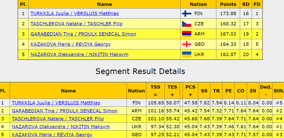 Присутствуют небольшие помарки в начале программы у финских фигуристов, но очень плавно выглядит на льду дуэт, прекрасно скольжение они демонстрируют. Пусть технически программа оснащена не особо сильно, но они очень чувственно показывают этот танец, будто бы проживая его, пропуская через себя. Это было действительно очень красиво, чувственно, и довольны сами собой фигуристы.