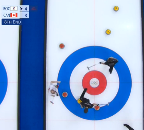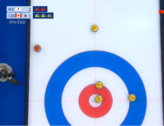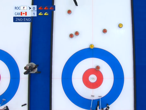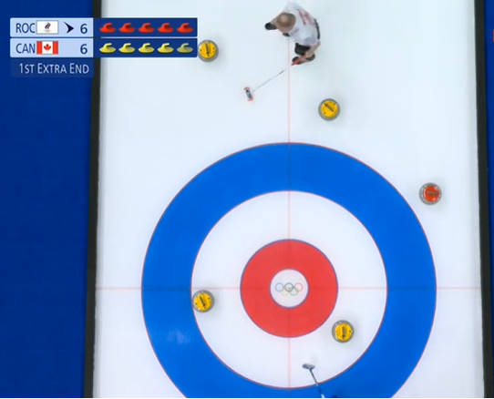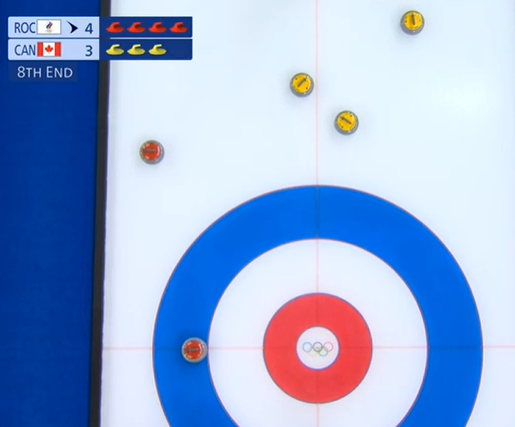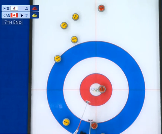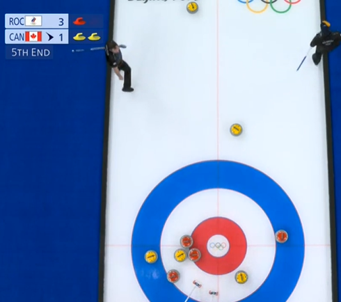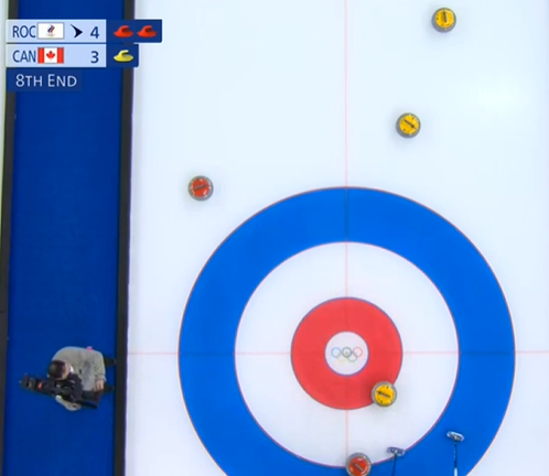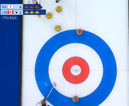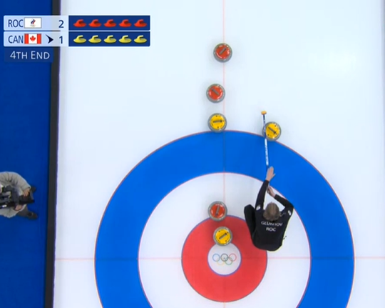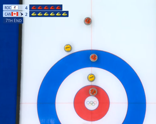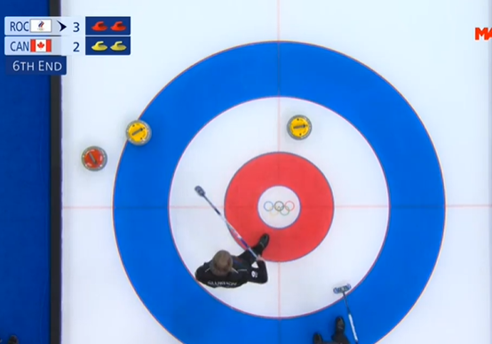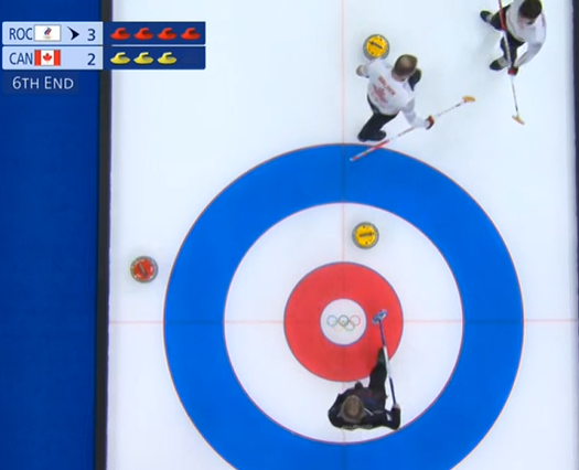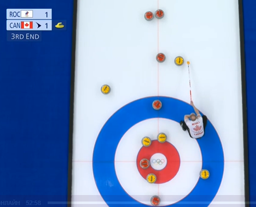 В один камень канадцы берут этот энд и у России будет право последнего броска. 3:2 в пользу наших после половины игры. Пятиминутный перерыв.