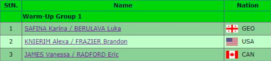 Открывают выступления финальной группы россияне Анастасия Мишина и Александр Галлямов. Они катаются под музыку из балета «Эсмеральда».