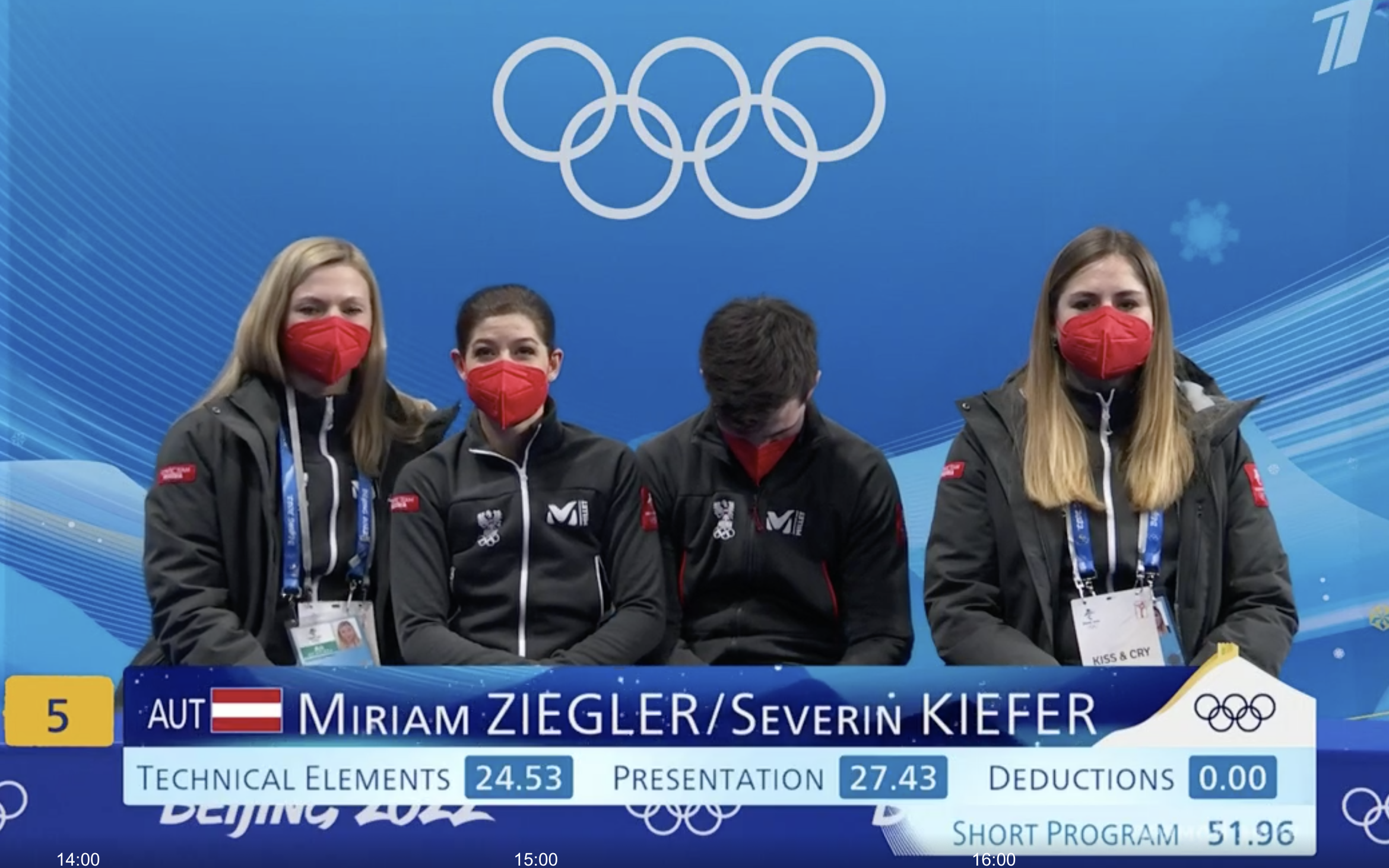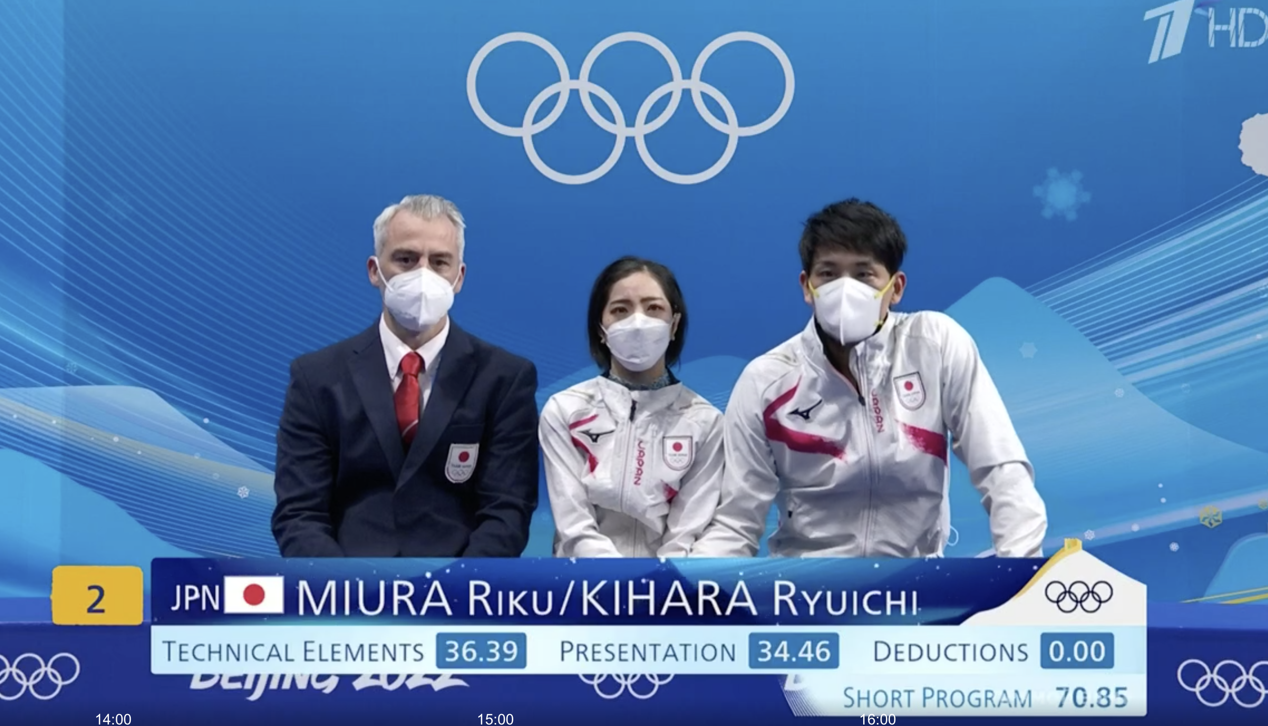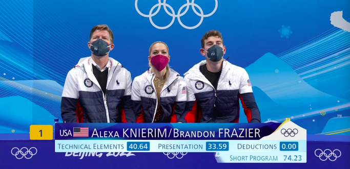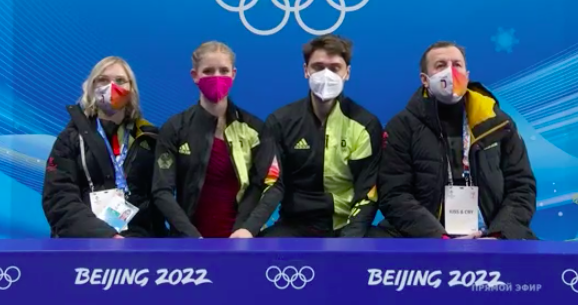 Тоже не смогли обойтись без ошибок фигуристы, не хватило им немного скорости и синхронности. Но сами спортсмены после короткой программы отправляются в kiss and cry с улыбками.