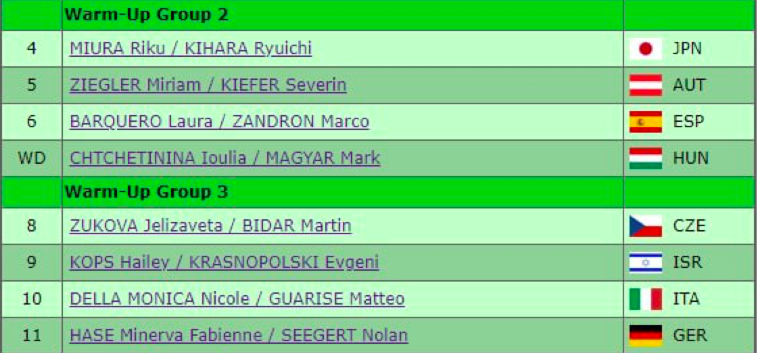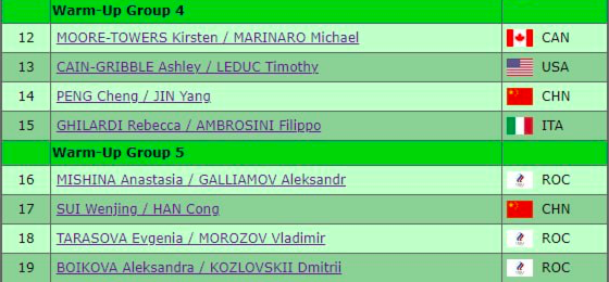 Три российские пары выступят в финальной разминке вместе с двукратными чемпионами мира из Китая — Суй Вэньцзинь и Хань Цунем. Самые рейтинговые дуэты были отправлены в конец как гвоздь программы.