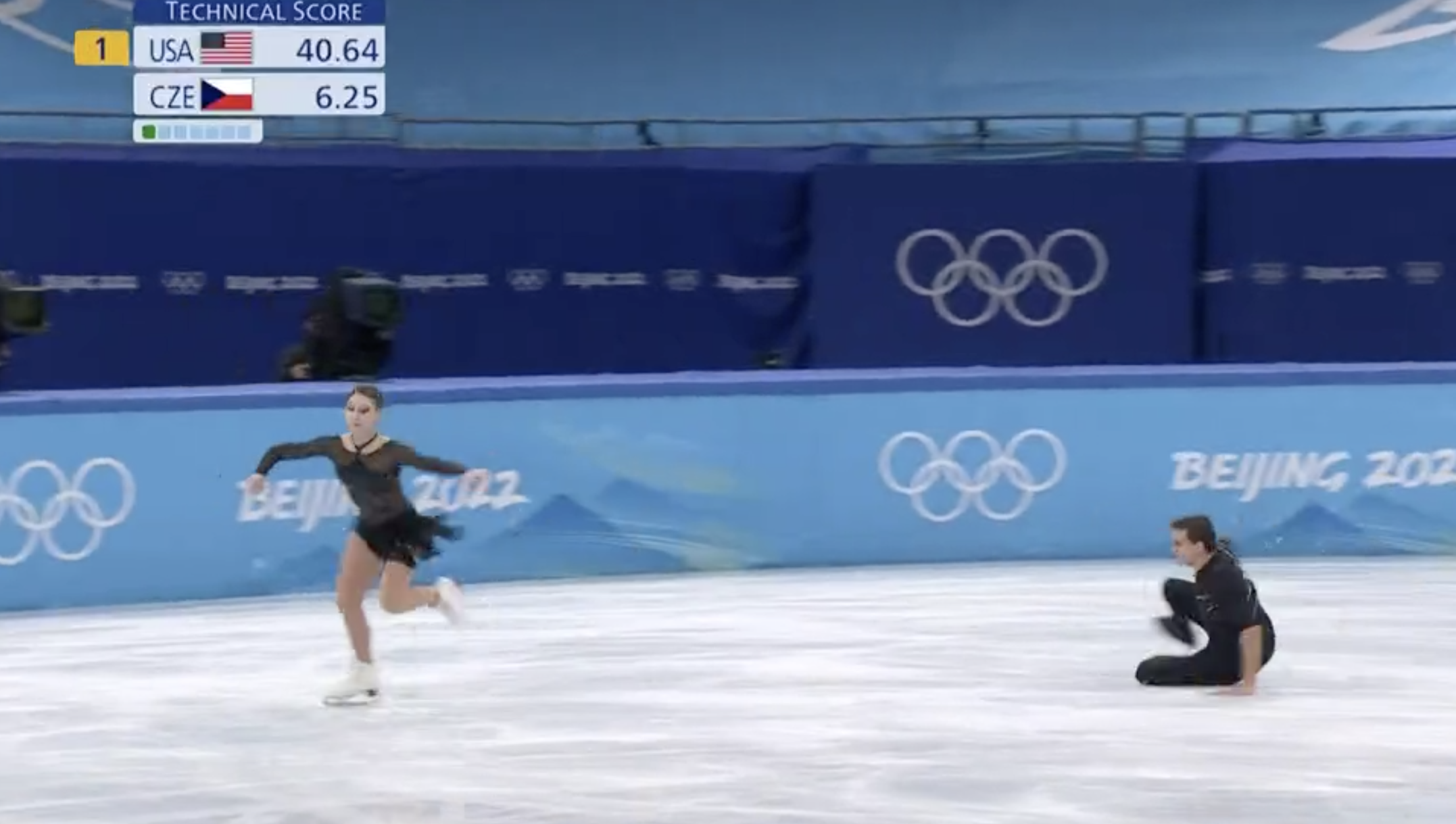 Ой, что случилось? Ребекка упала на ровном месте, когда партнеры просто катились от одного элемента к другому. И такое бывает. Теперь с них снимут штрафной балл за падение.