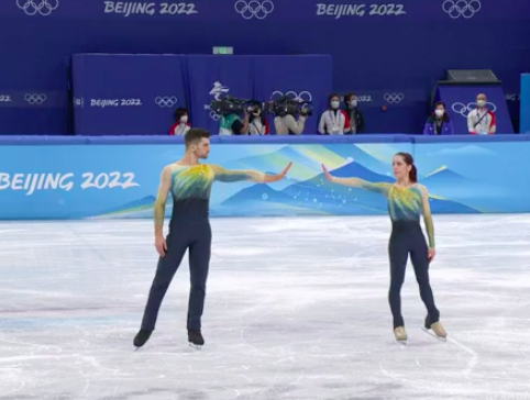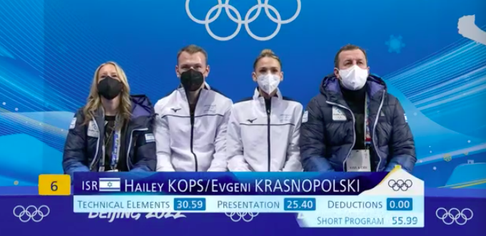 Следующими выступают Хэйли Копс и Евгений Краснопольский из Израиля. Они катаются под Torn (Nathan Lanier). Кстати, у Краснопольского это уже седьмая партнерша в карьере, и он участвует в своих третьих Играх — и на каждых был с разной партнершей.