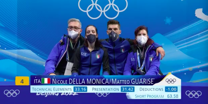 Следующими выступают Николь делла Моника и Маттео Гуаризе из Италии. Они катаются под Let It Be (From Across The Universe) в костюмах, раскрашенных в цвета галактики.
