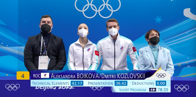 Бойкова и Козловский получают за короткую программу 78,59 балла. Это промежуточное четвертое место. Им придется выдать свой лучший прокат, чтобы побороться за медаль.