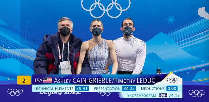 Следующими выступают Эшли Кейн-Гриббл и Тимоти Ледюк из США. Они катаются под музыку из кинофильма «Белый ворон», посвященную танцору Нурееву — The Wight Crow (Ilan Eshkeri).