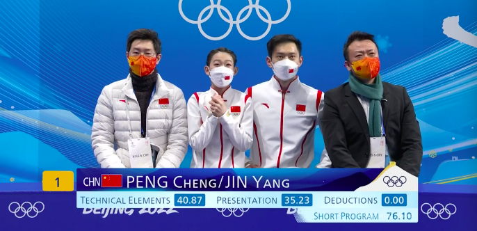 Шен Пен и Янь Цзинь получают за короткую программу 76,10 балла. Это новые лидеры таблицы.