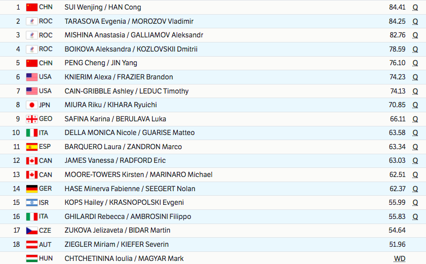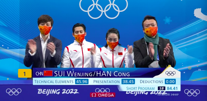 Суй Вэньцзин и Хань Цун получают за короткую программу 84,41 балла. Это мировой рекорд! Почти на два балла они обходят Мишину и Галлямова и становятся новыми лидерами таблицы.