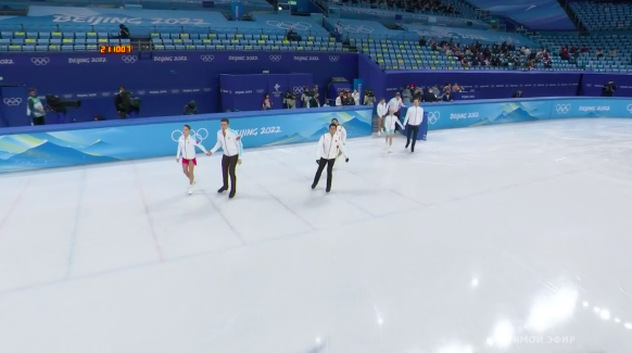 Начинается разминка финальной группы участников. Сейчас мы увидим прокаты российских пар — Мишиной и Галлямова, Бойковой и Козловского, Тарасовой и Морозова, а также посмотрим на мощный китайский дуэт — Суй Вэньцзинь и Хань Цуня, которые являются одними из главных фаворитов Олимпиады.