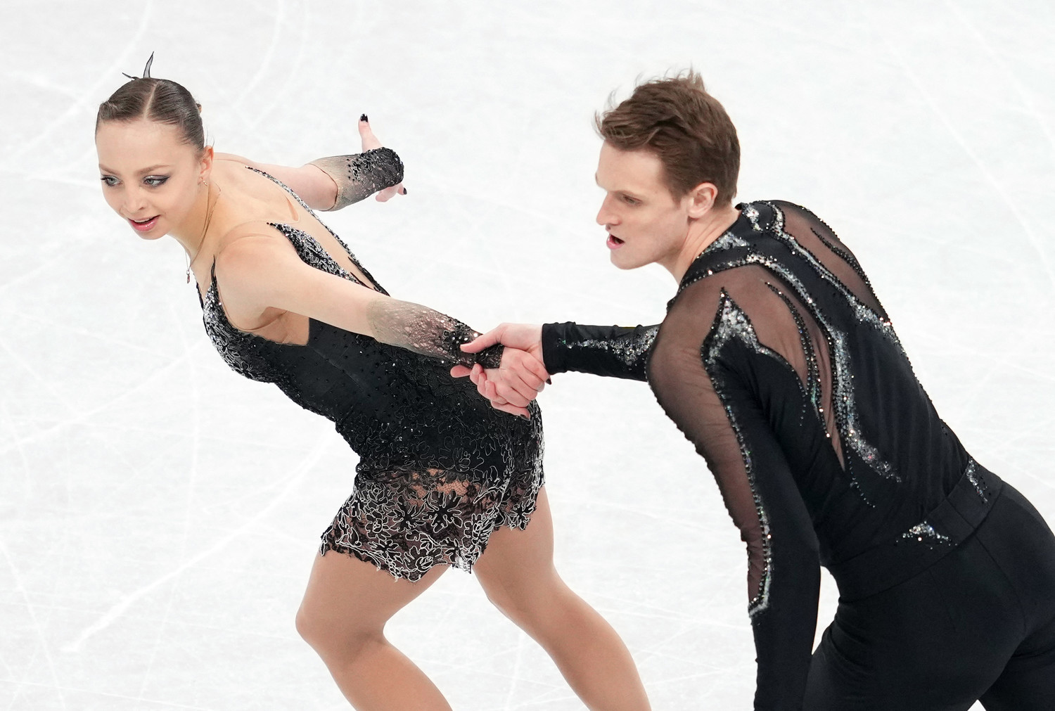 Очень красивая дорожка шагов у американцев — с синхронными взмахами руками, словно они оба — изящные белые птицы, и с параллельными прыжками в шпагат. Арена вздыхает в восторге.