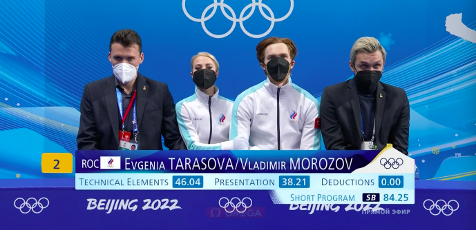Тарасова и Морозов получают за короткую программу 84,25 балла. Они уступили китайцам всего 0,16! И они — первые по оценке за технику! Фантастика.