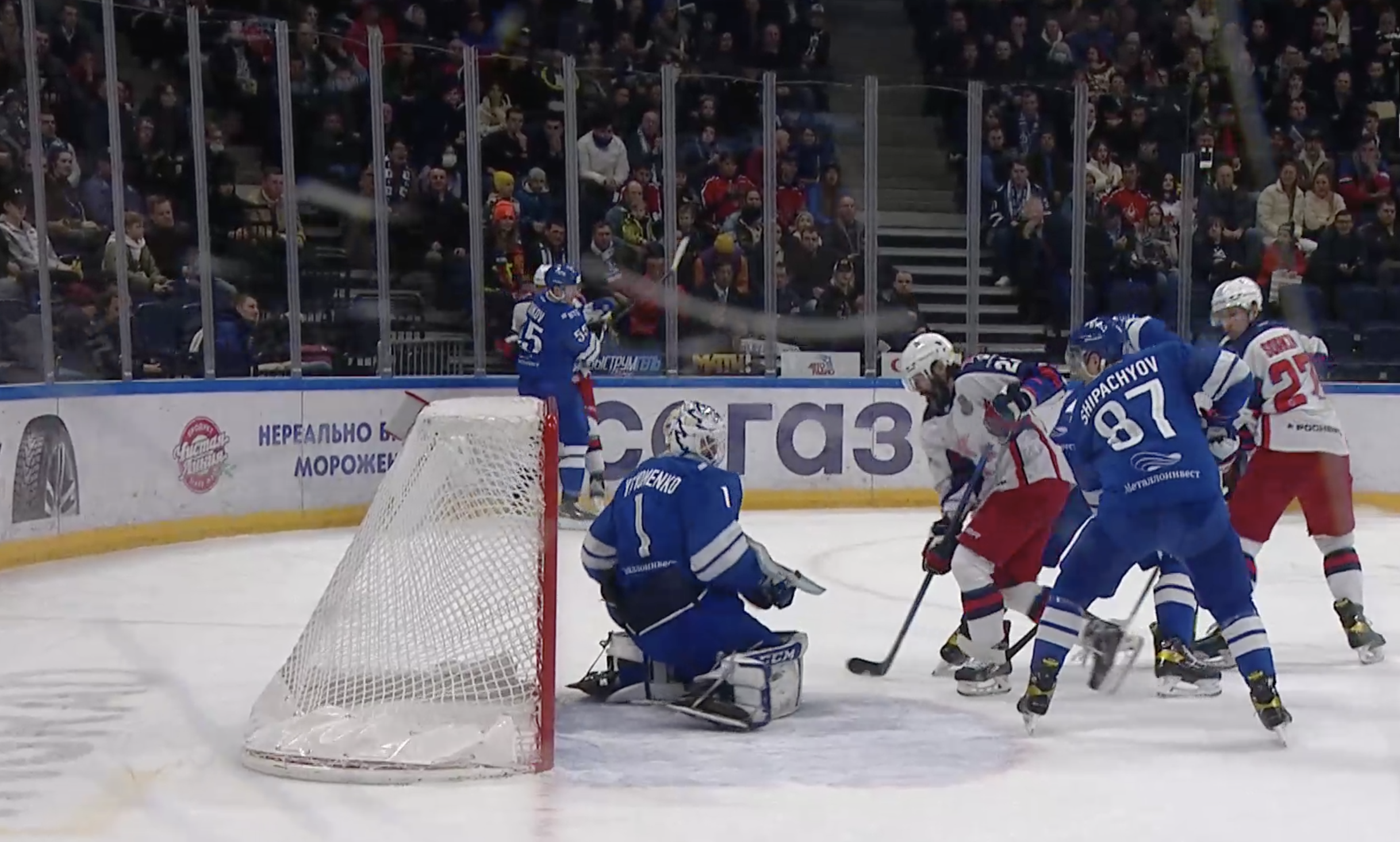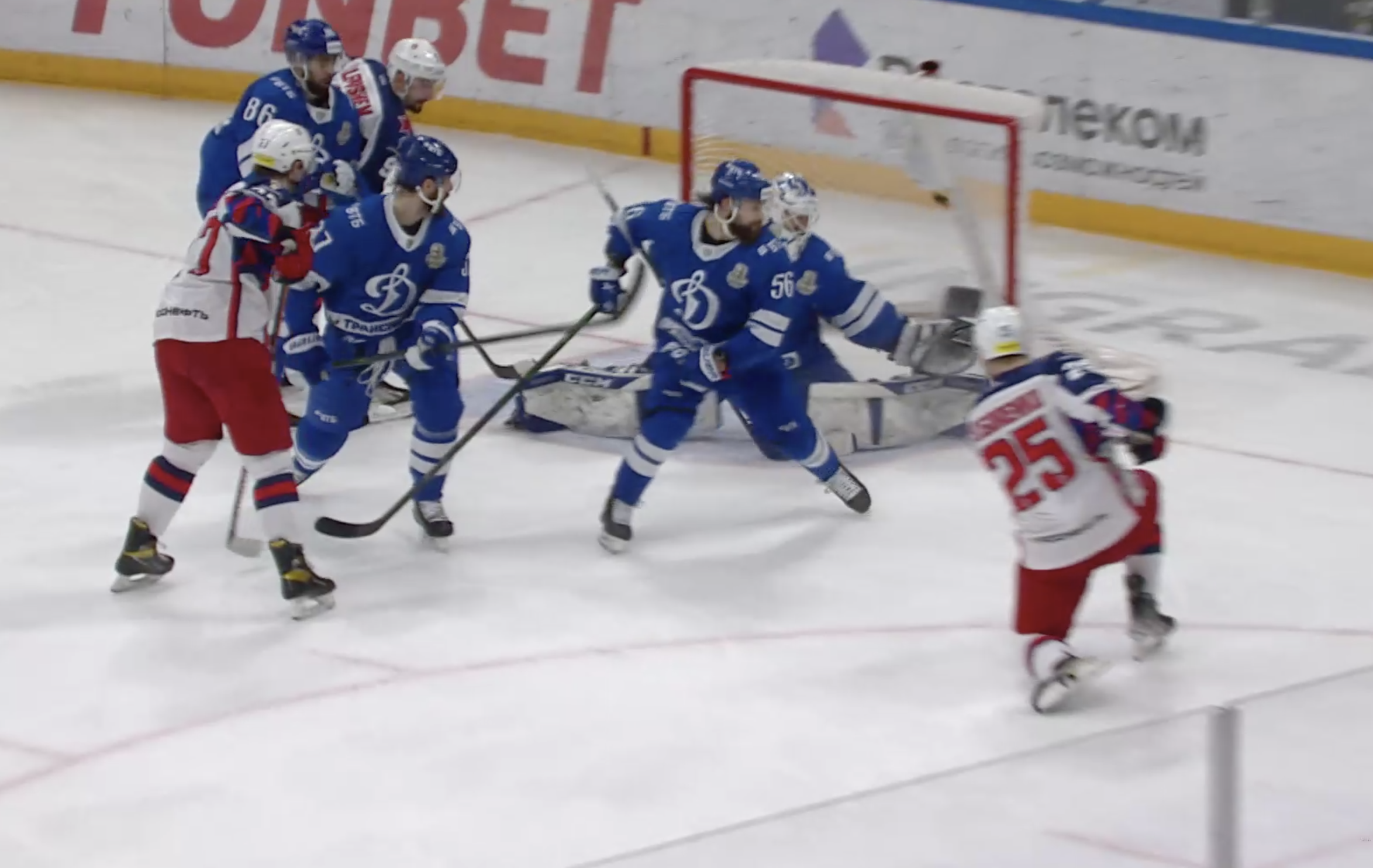 Игумнов потрясающе прикрывает шайбу корпусом, не позволяя сопернику завладеть ею. Первая затяжная атака «Динамо» во втором периоде.