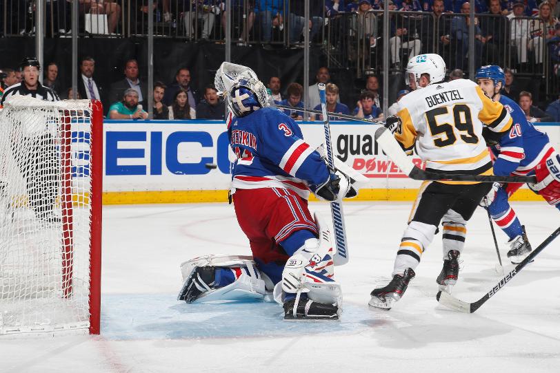 Шайба пока в основном под контролем нью-йоркцев, но прессинг «Пенс» дает плоды, и вот уже свой первый сейв делает Шестеркин. Вернее, не совсем сейв — просто вступил в игру после потери партнеров. А вот теперь и сейв. И проброс.