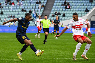 Прострельная передача Будимира не прошла на дальнюю штангу — Динь не захотел пропускать мяч.