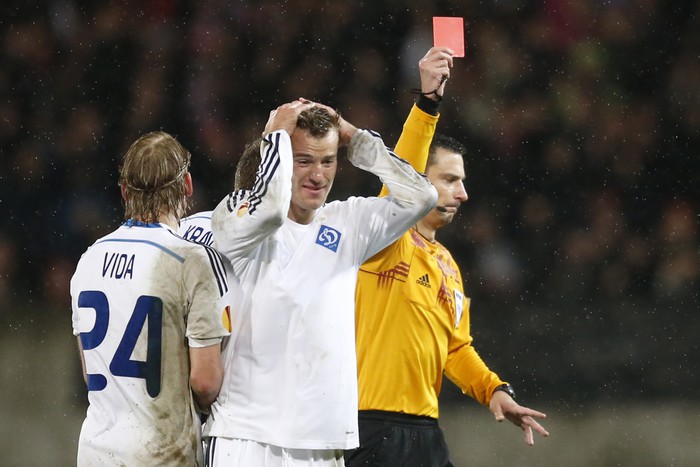 Киевляне более 60 минут играли в меньшинстве — на 39-й минуте был удален Андрей Ярмоленко, на 45-й минуте — Юнес Беланда.