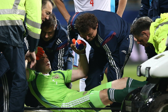 Уже на первой минуте с трибун стадиона в голкипера россиян Игоря Акинфеева был брошен файер. Встреча была остановлена, а Акинфеев покинул поле на носилках. Спустя некоторое время игра возобновилась.