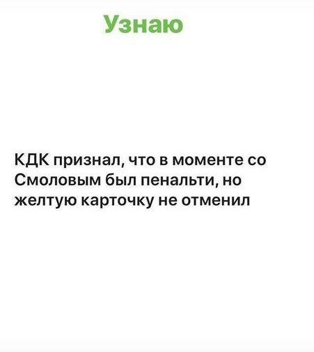 Футболист в инстаграме опубликовал текст: «КДК признал, что на моменте со Смоловым был пенальти, но желтую карточку не отменил».