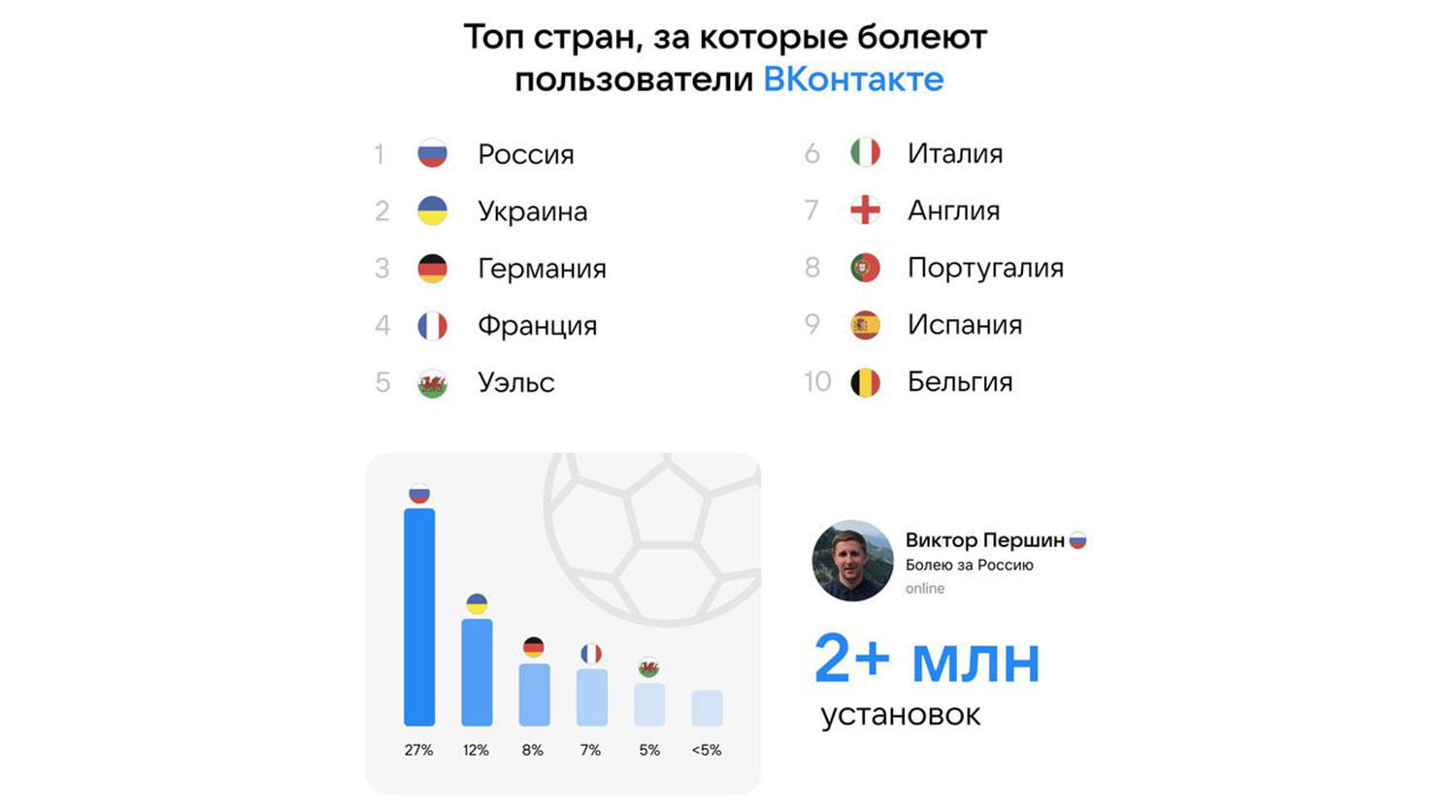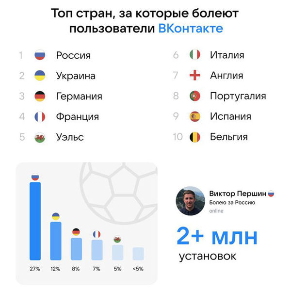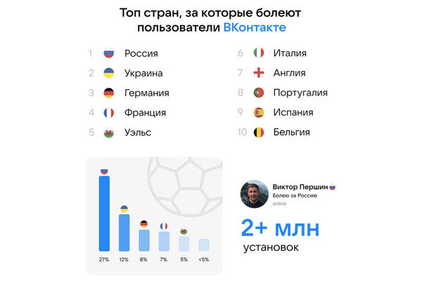 Социальная сеть «ВКонтакте» специально к чемпионату Европы — 2020 представила футбольные эмодзи-статусы с иконками флагов сборных. На данный момент пользователи установили их больше двух миллионов раз. Благодаря этому удалось узнать за какие сборные болеют пользователи сети.
