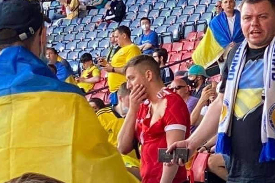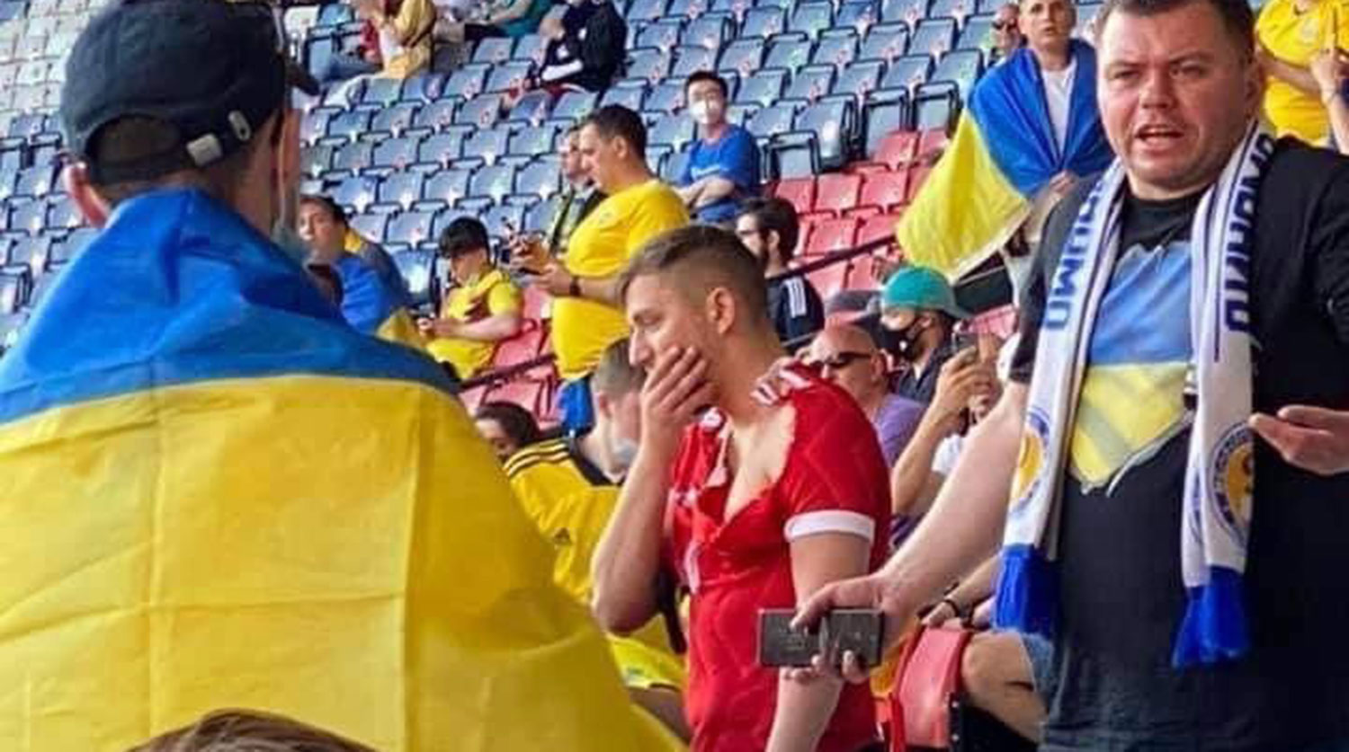 Telegram-канал OFNEWS опубликовал видео стычки украинских фанатов со зрителем с флагом России во время матча 1/8 финала чемпионата Европы — 2020 между сборными Украины и Швеции.