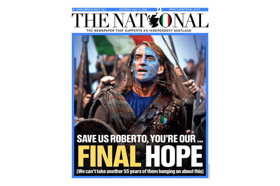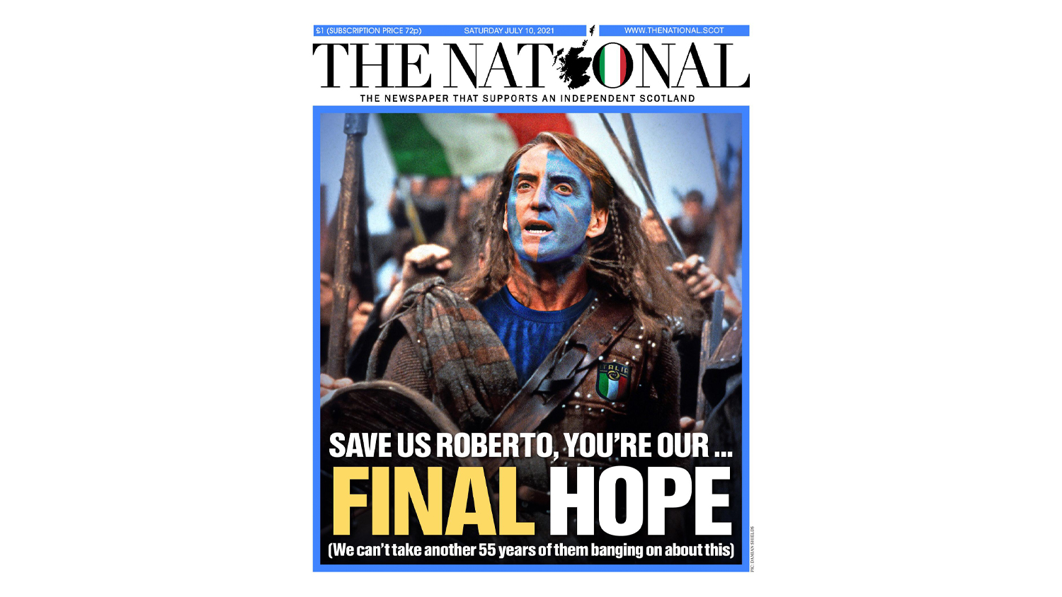 Шотландская газета The National поместила на обложку главного тренера сборной Италии Роберто Манчини в образе героя фильма «Храброе сердце».