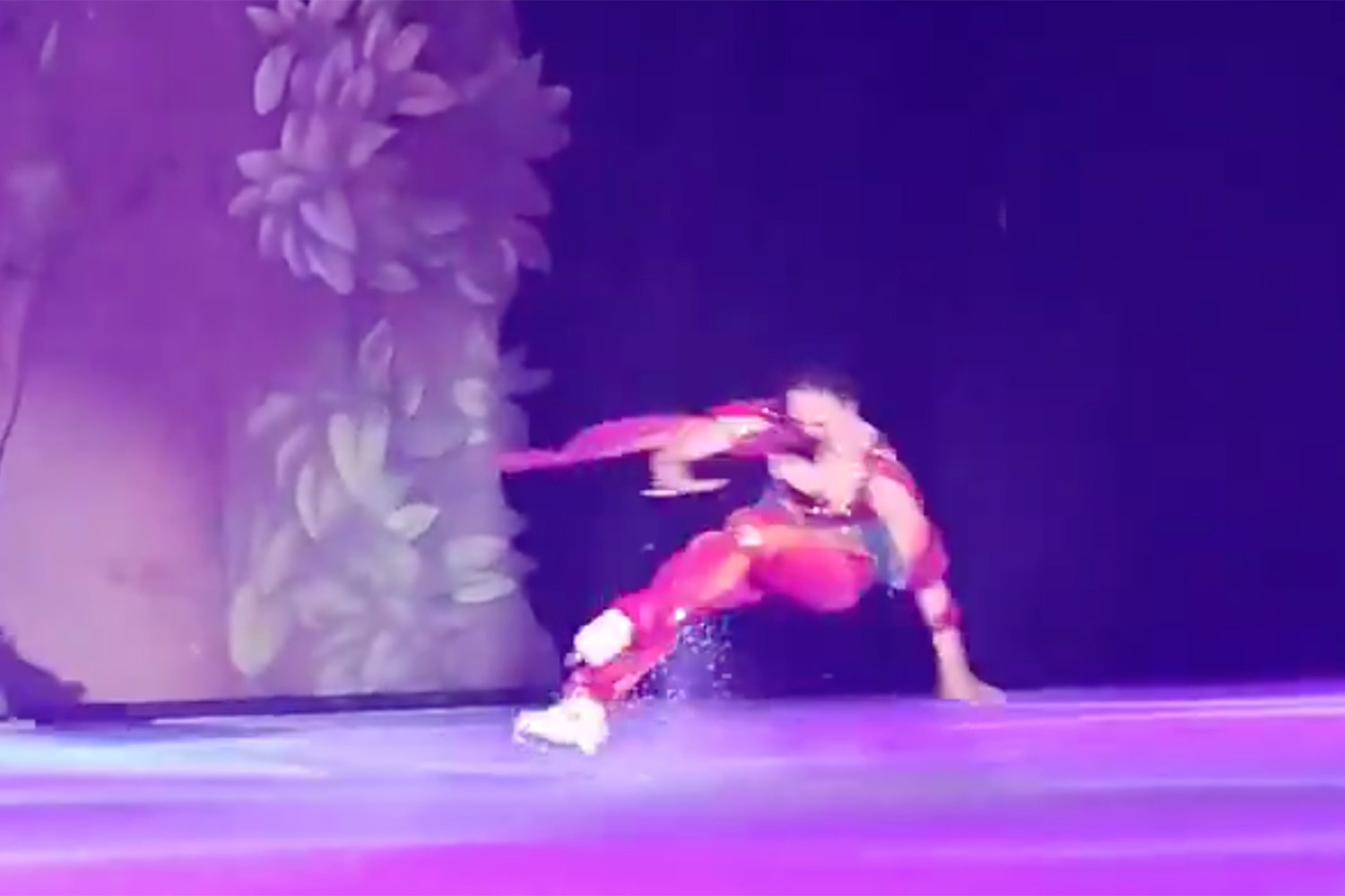Фигуристка Алина Загитова, которая впервые исполняла главную роль Людмилы полностью, не справилась с тройным флипом и всем телом упала на лед. Видео доступно по ссылке.
