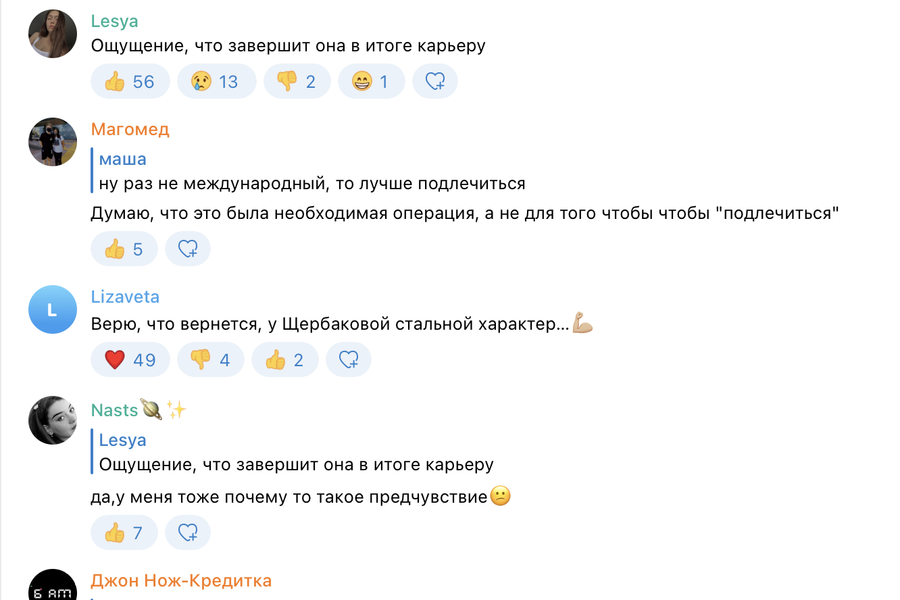 «Ощущение, что завершит она в итоге карьеру», — написал пользователь под ником Lesya. Этот комментарий собрал 56 лайков и 13 плачущих эмодзи.