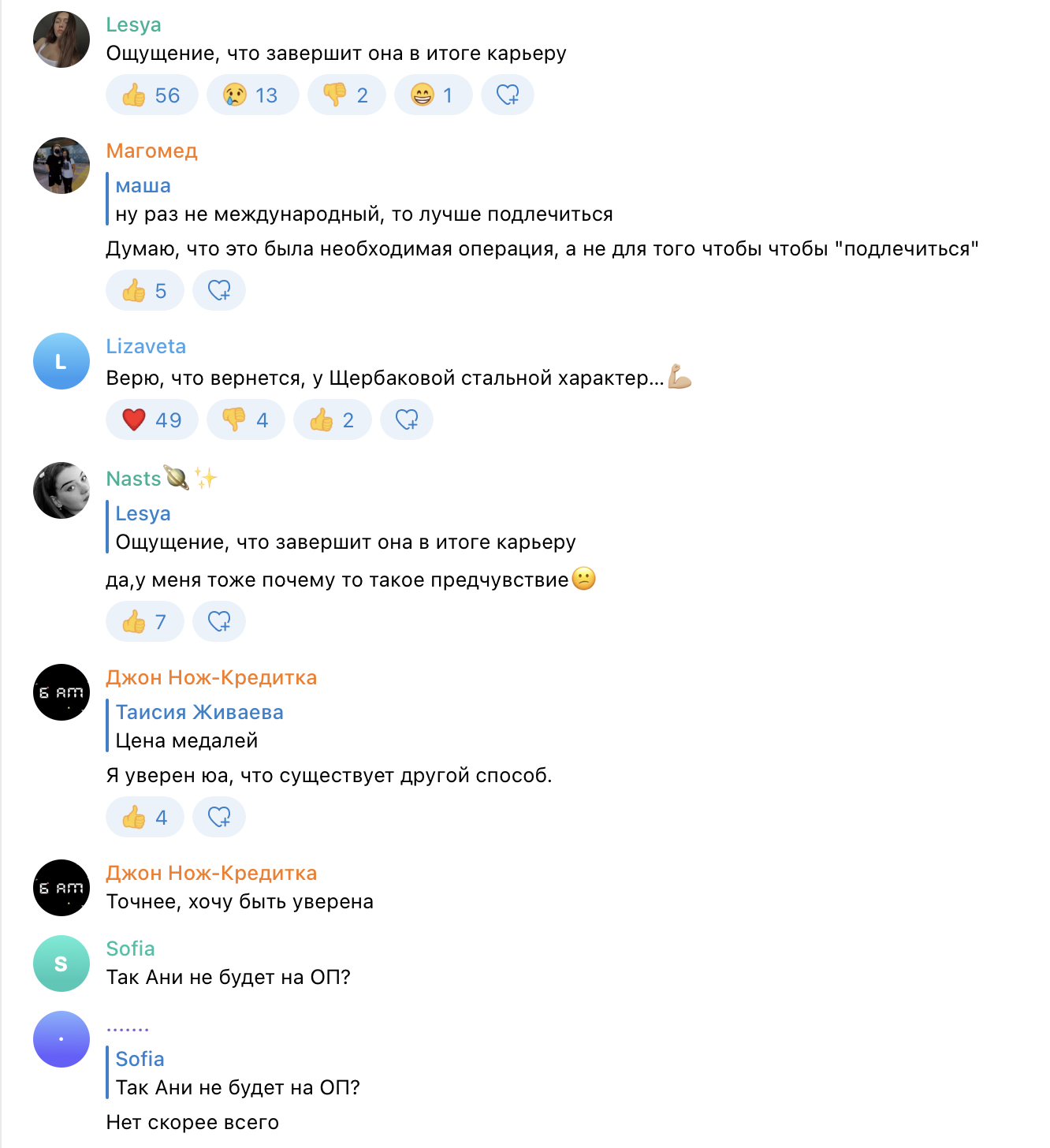 «Боже, еще одна! За что этим детям такое?», «Ну, лучше операцию в такой сезон сделать. А так, конечно, большой спорт калечит с юности», «Это цена медалей»,