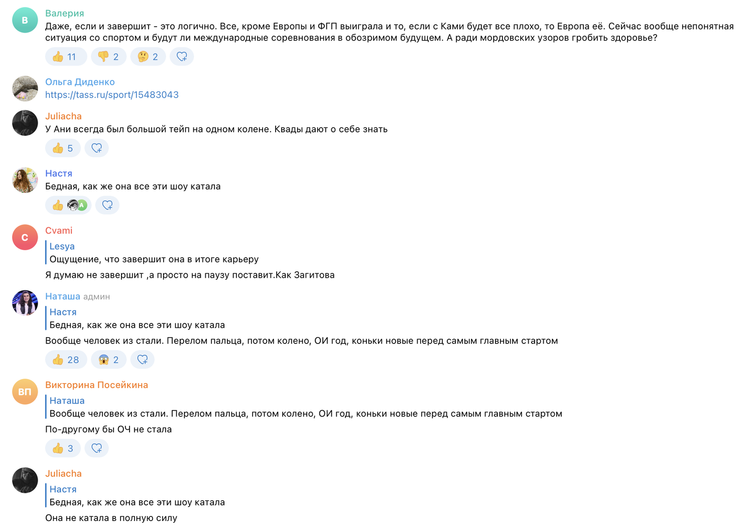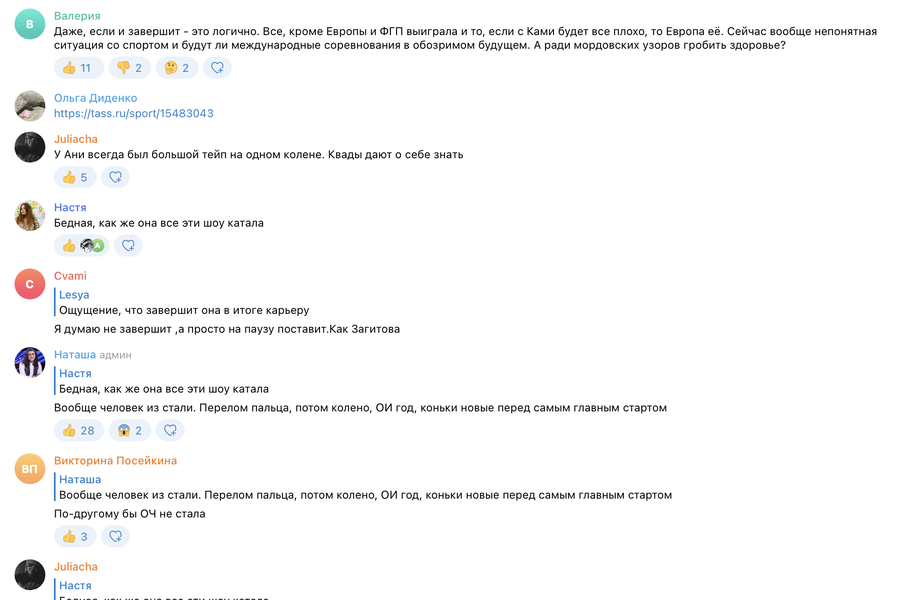 «Даже, если и завершит — это логично. Все, кроме Европы и финала Гран-при выиграла. Сейчас вообще непонятная ситуация со спортом, и неясно, будут ли международные соревнования в обозримом будущем. А ради «Мордовских узоров» гробить здоровье?» — ответил пользователь Валерия.